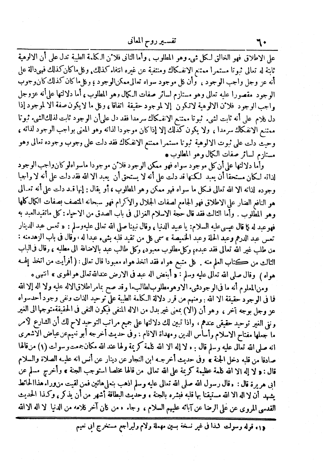 ومن المعلوم أنه ما في الوجود شيء إلا وهو مطلوب لطالب ما وقد صح بما مر إطلاق الإله عليه ولا إله إلا الله فما في الوجود حقيقة إلا الله : ومنهم من قرر دلالة الكلمة الطيبة على توحيد الذات ونفي وجود أحد سواه عز و جل بوجه آخر وهو أن إلا بمعنى غير بدل من الإله المنفي فيكون النفي في الحقيقة متوجها إلى الغير ونفي الغير توحيد عندهم وإذا تبين لك دلالتها على جميع مراتب التوحيد لاح لك أن الشارع لأمر ما جعلها مفتاح الإسلام وأساس الدين ومهداة الأنام : وفي حديث أخرجه أبو نعيم عن عياض الأشعري أنه صلى الله تعالى عليه وسلم قال : لا إله إلا الله كلمة كريمة ولها عند الله مكان جمعت وسولت من قالها صادقا من قلبه دخل الجنة وفي حديث أخرجه ابن النجار عن دينار عن أنس أنه عليه الصلاة و السلام قال : لا إله إلا الله كلمة عظيمة كريمة على الله تعالى من قالها مخلصا استوجب الجنة وأخرج مسلم عن أبي هريرة قال : قال رسول الله صلى الله تعالى عليه وسلم اذهب بنعلي هاتين فمن لقيت من وراء هذا الحائط يشهد أن لا إله إلا الله مستيقنا بها قلبه فبشره بالجنة وحديث البطاقة أشهر من أن يذكر وكذا الحيث القدسي المروي عن علي الرضا عن آبائه عليهم السلام وجاء من كان آخر كلامه من الدنيا لا إله إلا الله