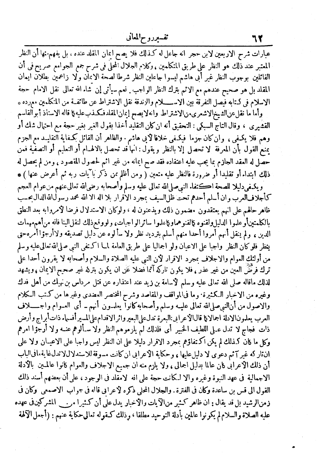 عبارات شرح الأربعين لابن حجر أنه جاعل له كذلك فلا يصح إيمان المقلد عنده بل يفهم منها أن النظر المعتبر عند ذلك هو النظر على طريق المتكلمين وكلام الجلال المحلي في شرح جمع الجوامع صريح في أن القائلين بوجوب النظر غير أبي هاشم ليسوا جاعلين النظر شرطا لصحة الإيمان ولا زاعمين بطلان إيمان المقلد بل هو صحيح عندهم مع الإثم بترك النظر الواجب نعم سيأتي إن شاء الله تعالى نقل الإمام حجة الإسلام في كتابه فيصل التفرقة بين الإسلام والزندقة نقل الأشتراط عن طائفة من المتكلمين مع رده