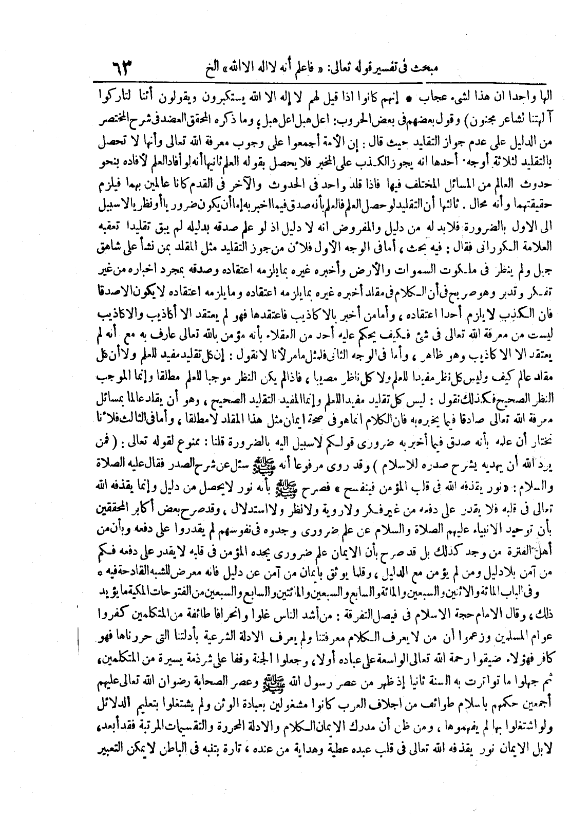 إنهم كانوا إذا قيل لهم لا إله إلا الله يستكبرون ويقولون أئنا لتاركوا آلهتنا لشاعر مجنون وقول بعضهم في بعض الحروب : أعل هبل أعل هبل وما ذكره المحقق العضد في شرح المختصر من الدليل على عدم جواز التقليد حيث قال : إن الأمة أجمعوا على وجوب معرفة الله تعالى وأنها لا تحصل بالتقليد لثلاثة أوجه أحدها أنه يجوز الكذب على المخبر فلا يحصل بقوله العلم ثانيها أنه لو أفاد العلم لأفاده بنحو حدوث العالم من المسائل المختلف فيها فإذا قلد واحد في الحدوث والآخر في القدم كانا عالمين بهما فيلزم حقيقتهما وأنه محال ثالثهما أن التقليد لو حصل العلم فالعلم بأنه صدق فيما أخبر به إما أن يكون ضروريا أو نظريا لا سبيل إلى الأول بالضرورة فلا بد له من دليل والمفروض أنه لا دليل إذ لو علم صدقه بدليله لم يبق تقليدا تعقبه العلامة الكوراني فقال : فيه بحث أما في الوجه الأول فلأن من جوز التقليد مثل المقلد بمن نشأ على شاهق جبل ولم ينظر في ملكوت السماوات والأرض وأخبره غيره بما يلزمه اعتقاده وصدقه بمجرد إخباره من غير تفكر وتدبر وهو صريح في أن الكلام في مقلد أخبره غيره بما يلزمه اعتقاده وما يلزمه اعتقاده لا يكون إلا صدقا فإن الكذب لا يلزم أحدا اعتقاده وأما من أخبر بالأكاذيب فاعتقدها فهو لم يعتقد إلا أكاذيب والأكاذيب ليست من معرفة الله تعالى في شيء فكيف يحكم عليه أحد من العقلاء بأنه مؤمن بالله تعالى عارف به مع أنه لم يعتقد إلا الأكاذيب وهو ظاهر وأما في الوجه الثاني فلمثل ما مر لأنا لا نقول : إن كل تقليد مفيد للعلم ولا أن كل مقلد عالم كيف وليس كل نظر مفيدا للعلم ولا كل ناظر مصيبا فإذا لم يكن موجبا للعلم مطلقا وإنما الموجب النظر الصحيح فكذلك نقول : ليس كل تقليد مفيدا للعلم وإنما المفيد التقليد الصحيح وهو أن يقلد عالما بمسائل معرفة الله تعالى صادقا فيما يخبره به فإن الكلام إنما هو في صحة إيمان مثل هذا المقلد لا مطلقا وأما في الثالث فلأنا نختار أن علمه بأنه صدق فيما أخبر به ضروري قولكم لا سبيل إليه بالضرورة قلنا : ممنوع لقوله تعالى : فمن يرد الله أن يهديه يشرح صدره للأسلام وقد روي مرفوعا أنه صلى الله عليه و سلم سئل عن شرح الصدر فقال عليه الصلاة و السلام : نور يقذفه الله في قلب المؤمن فينفسح فصرح صلى الله عليه و سلم بأنه نور لا يحصل من دليل وإنما يقذفه الله تعالى في قلبه فلا يقدر على دفعه من غير فكر ولا روية ولا نظر ولا استدلال وقد صرح بعض أكابر المحققين بأن توحيد الأنبياء عليهم الصلاة والسلام عن علم ضروري وجدوه في نفوسهم لم يقدروا على دفعه وبأن من أهل الفترة من وجد كذلك بل قد صرح بأن الإيمان علم ضروري يجده المؤمن في قلبه لا يقدر على دفعه فكم من آمن بلا دليل ومن لم يؤمن مع الدليل وقلما يوثق بإيمان من آمن عن دليل فإنه معرض للشبه القادحة فيه