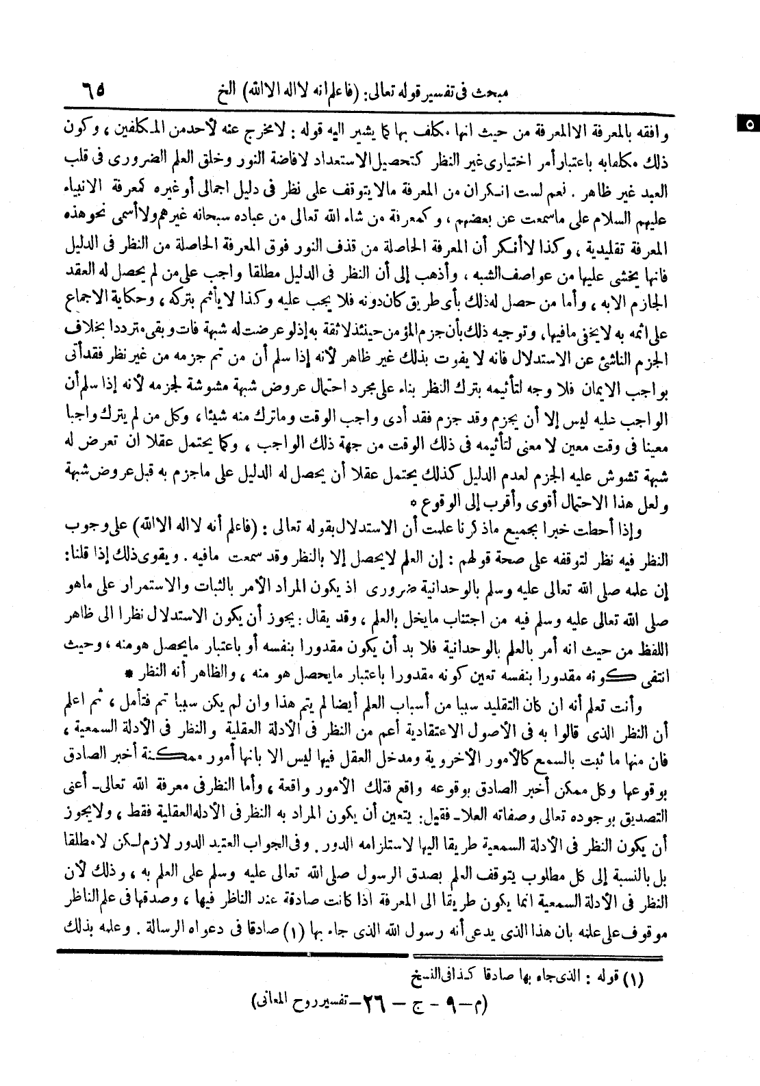 وأنت تعلم أنه إن كان التقليد سببا من أسباب العلم لم يتم هذا وإن لم يكن سببا تم فتأمل ثم اعلم أن النظر الذي قالوا به في الأصول الأعتقادية أعم من النظر في الأدلة العقلية والنظر في الأدلة السمعية فإن منها ما ثبت بالسمع كالأمور الأخروية ومدخل العقل فيها ليس إلا بأنها أمور ممكنة أخبر الصادق بوقوعها وكل ممكن أخبر الصادق بوقوعه واقع فتلك الأمور واقعة وأما النظر في معرفة الله تعالى أعني التصديق بوجوده تعالى وصفاته العلا فقيل : يتعين أن يكون المراد به النظر في الألة العقلية فقط ولا يجوز أن يكون النظر في الأدلة السمعية طريقا إليها لاستلزامه الدور وفي الجواب العتيد الدور لازم لكن لا مطلقا بل بالنسبة إلى كل مطلوب يتوقف العلم بصدق الرسول صلى الله تعالى عليه وسلم به وذلك لأن النظر في الأدلة السمعية إنما يكون طريقا إلى المعرفة إذا كانت صادقة عند الناظر فيها وصدقها في علم الناظر موقوف على علمه بأن هذا الذي يدعي أنه رسول الله الذي جاء بها صادقا في دعواه الرسالة وعلمه بذلك