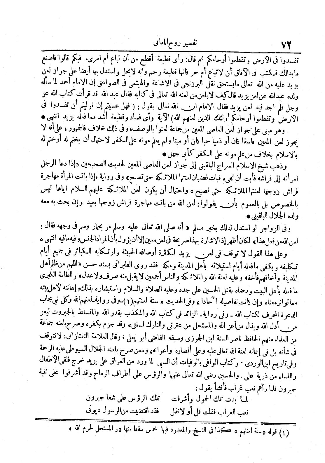 وعلى هذا القول لا توقف في لعن يزيد لكثرة أوصافه وارتكابه الكبائر في جميع أيام تكليفه ويكفي ما فعله أيام استيلائه بأهل المدينة ومكة فقد روي الطبراني بسند حسن اللهم من ظلم أهل المدينة وأخافهم فأخفه وعليه لعنة الله والملائكطة والناس أجمعين لا يقبل منه صرف ولا عدل والطاقة الكبرى ما فعله بأهل البيت ورضاه بقتل الحسين على جده وعليه الصلاة و السلام واستبشاره بذلك وإهانته لأهل بيته مما تواتر معناه وإن تفاصيله آحادا وفي الحديث ستة لعنتهم وفي رواية لعنهم الله وكل نبي مجاب الدعوة المحرف لكتاب الله وفي رواية الزائد في كتاب الله والمكذب بقدر الله والمتسلط بالجبروت ليعز من أذل الله ويذل من أعز الله والمستحل من عترتي والتارك لسنتي وقد جزم بكفره وصرح بلعنه وصرح بلعنه جماعة من العلماء منهم الحافظ ناصر السنة ابن الجوزي وسبقه القاضي أبو يعلى وقال العلامة التفتازاني : لا نتوقف في شأنه بل في إيمانه لعنة الله تعالى وعلى أنصاره وأعوانه وممن صرح بلعنه الجلال السيوطي عليه الرحمة وفي تاريخ ابن الوردي وكتاب الوافي بالوافيات أن السبي لما ورد من العراق على يزيد خرج فلقي الأطفال والنساء من ذرية علي والحسين رضي الله تعالى عنهما والرؤس على أطراف الرماح وقد أشرفوا على ثنية جيرون فلما رآهم نعب غراب فأنشأ يقول : لما بدت تلك الحمول وأشرفت تلك الرؤس على شفا جيرون نعب الغراب فقلت قل أو لا تقل فقد اقتضيت من الرسول ديوني