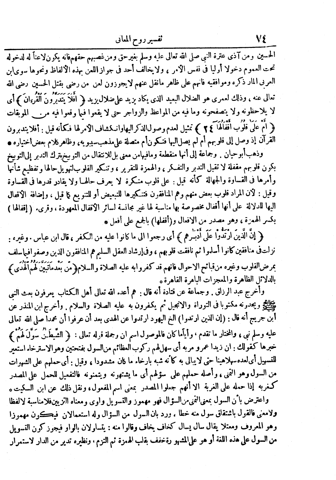 الحسين ومن آذى عترة النبي صلى الله تعالى عليه وسلم بغير حق من غضبهم حقهم فإنه يكون لاعنا له لدخوله تحت العموم دخولا أوليا في نفس الأمر ولا يخالف أحد في جواز اللعن بهذه الألفاظ ونحوها سوى ابن العربي المار ذكره وموافقيه فإنهم على ظاهر ما نقل عنهم لا يجوزون لعن من رضي بقتل الحسين رضي الله تعالى عنه وذلك لعمري هو الضلال البعيد الذي يكاد يزيد على ضلال يزيد أفلا يتدبرون القرآن أي لا يلاحظونه ولا يتصفحونه وما فيه من المواعظ والزواجر حتى لا يقعوا فيما وقعوا فيه من الموبقات أم على قلوب أقفالها