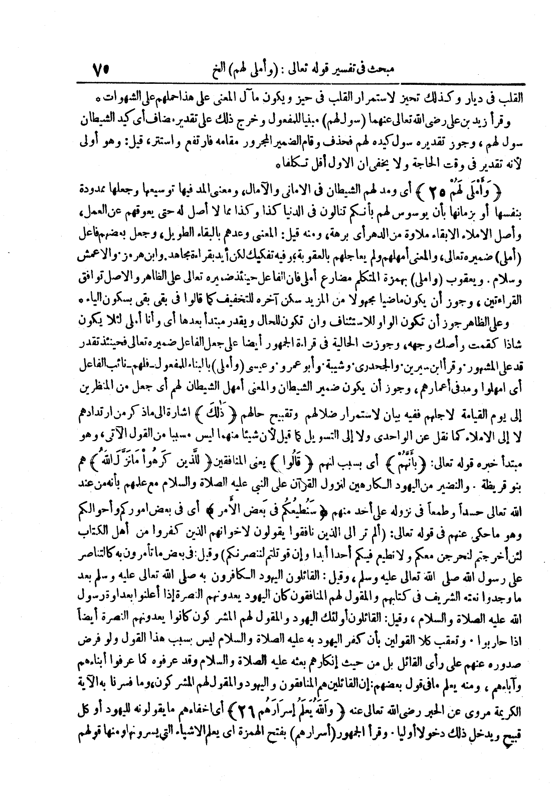 - ومد لهم الشيطان في الأماني والآمال ومعنى المد فيها توسيعها وجعلها ممدودة بنفسها أو بزمانها بأن يوسوس لهم بأنكم تنالون في الدنيا كذا مما لا أصل له حتى يعوقهم عن العمل وأصل الإملاء الإبقاء ملاومة من الدهر أي برهة ومنه قيل : المعنى وعدهم بالبقاء الطويل وجعل بعضهم فاعل أملي ضميره تعالى والمعنى أمهلهم ولم يعالجهم بالعقوبة وفيه تفكيك لكن أيد بقراءة مجاهد وابن هرمز والأعمش وسلام ويعقوب وأملي بهمزة المتكلم مضارع أملي فإن الفاعل حينئذ ضميره تعالى على الظاهر والأصل توافق القرائتين وجوز أن يكون ماضيا مجهولا من المزيد سكن آخره للتخفيف كما قالوا في بقي بقى بسكون الياء