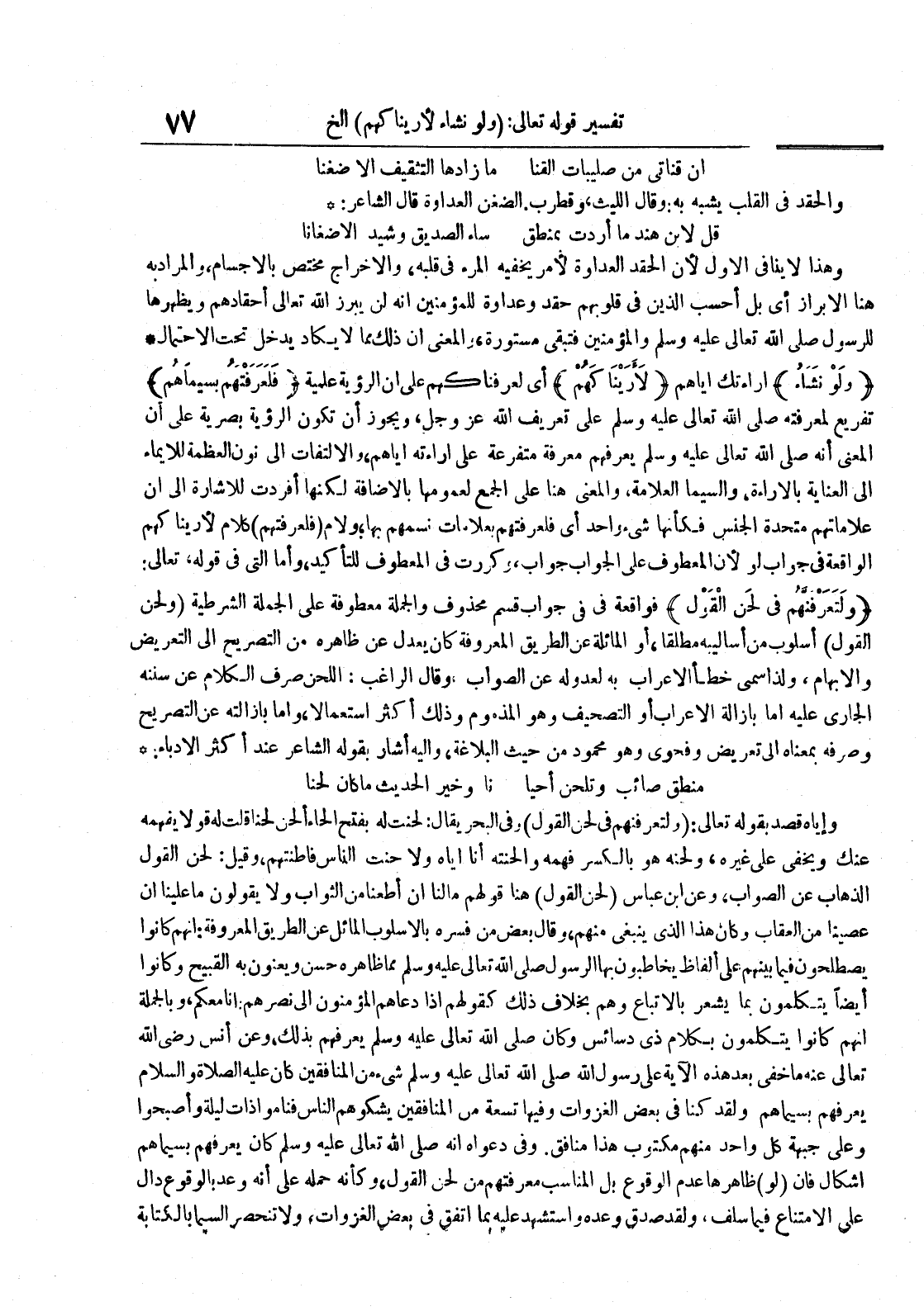 ولو نشاء إراءتك إياهم لأريناكهم أي لعرفناكهم على أن الرؤية علمية فلعرفتهم بسيماهم تفريع لمعرفته صلى الله تعالى عليه وسلم على تعريف الله عز و جل ويجوز أن تكون الرؤية بصرية على أن المعنى أنه صلى الله تعالى عليه وسلم يعرفهم معرفة متفرعة على إراءته إياهم والإلتفات إلى نون العظمة للإيماء إلى العناية بالإراءة والسيما العلامة والمعنى هنا على الجمع لعمومها بالإضافة لكنها أفردت للإشارة إلى أن علاماتهم متحدة الجنس فكأنها شيء واحد أي فلعرفتهم بعلامات نسمهم بها ولام فلعرفتهم كلام لأريناكهم الواقعة في جواب لو لأن المعطوف على الجواب جواب وكررت في المعطوف للتأكيد وأما التي في قوله تعالى : ولتعرفنهم في لحن القول فواقعة في جواب قسم محذوف والجملة معطوفة على الجملة الشرطية ولحن القول أسلوب من أساليبه مطلقا أو المائلة عن الطريق المعروفة كأن يعدل عن ظاهره من التصريح إلى التعريض والإبهام ولذا سمي خطأ الأعراب به لعدوله عن الصواب وقال الراغب : اللحن صرف الكلام عن سننه الجاري عليه إما بإزالة اراب أو التصحيف وهو المذموم وذلك أكثر استعمالا وأما بإزالته عن التصريح وصرفه بمعناه إلى تعريض وفحوى وهو محمود من حيث البلاغة وإليه أشار بقوله الشاعر عند أكثر الأدباء :