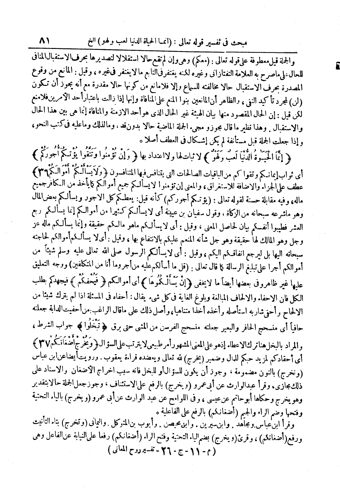 - عطف على الجزاء والأضافة للأستغراق والمعنى إن تؤمنوا لا يسألكم جميع أموالكم كما يأخذ من الكافر جميع ما له وفيه مقابلة حسنة لقوله تعالى : يؤتكم أجوركم كأنه قيل : يعطكم كل الأجور ويسألكم بعض المال وهو ما شرعه سبحانه من الزكاة وقول سفيان بن عيينة أي لا يسألكم كثيرا من أموالكم إنما يسألم ربع العشر فطيبوا أنفسكم بيان لحاصل المعنى وقيل : أي لا يسألأكم ما هو ما لكم حقيقة وإنما يسألأكم ما له عز و جل وهو المالك لها حقيقة وهو جل شأنه المنعم عليكم بالأنتفاع بها وقيل : أي لا يسألكم أموالكم لحاجته سبحانه إليها بل ليرجع اتفاقكم إليكم وقيل : أي لا يسألكم الرسول صلى الله تعالى عليه وسلم شيئا من أموالكم أحرا على تبليغ الرسالة كما قال تعالى : قل ما أسألكم عليه من أجر وما أنا من المتكلفين ووجه التعليق عليها غير ظاهر وفي بعضها أيضا ما لا يخفى إن يسألكموها أي أموالكم فيحفكم فيجهدكم بطلب الكل فإن الإخفاء والإلحاف المبالغة وبلوغ الغاية في كل شيء يقال : أحفاه في المسئلة إذا لم يترك شيئا من الإلحاق وأحفى شاربه استأصله وأخذه أخذا متناهيا وأصل ذلك على ما قال الراغب : من أحفيت الدابة جعلته حافيا أي منسحج الحافر والبعير جعلته منسج الفرسن من المشي حتى يرق تبخلوا جواب الشرط والمراد بالبخل هنا ترك الأعطاء إذ هو على المعنى المشهور أمر طبيعي لا يترتب على السؤال ويخرج أضغانكم