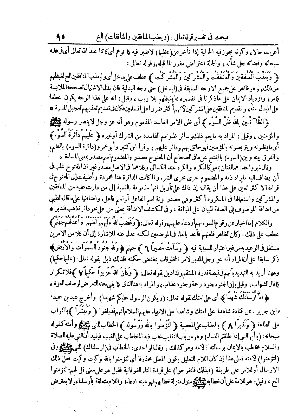 الظآنين بالله ظن السوء أي ظهر الأمر الفاسد المذموم وهو أنه عز و جل لا ينصر رسوله صلى الله عليه و سلم والمؤمنين وقيل : المراد به ما يعم ذلك وسائر ظنونهم الفاسدة نت الشرك أو غيره عليهم دائرة السوء أي يظنونه ويتربصونه بالمؤمنين فهو حائق بهم ودائر عليهم وقرأ ابن كثير وأبو عمرو دائرة السوء بالضم والفرق بينه وبين السوء بالفتح على ما في الصحاح أن المفتوح مصدر والمضموم اسم مصدر بمعنى المساءة