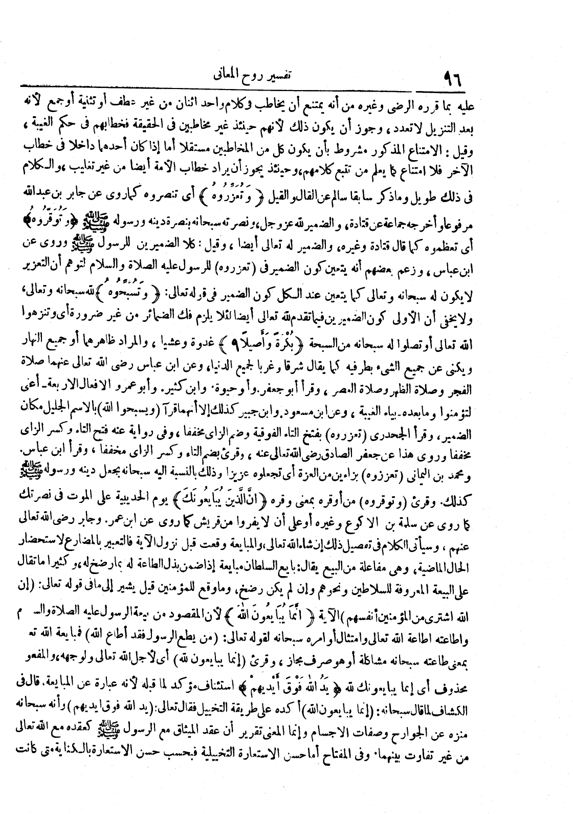 - غدوة وعشيا والمراد ظاهرهما أو جميع النهار ويكنى عن جميع الشيء بطرفيه كما يقال شرقا وغربا لجميع الدنيا وعن ابن عباس رضي الله تعالى عنهما صلاة الفجر وصلاة الظهر وصلاة العصر وقرأ أبو جعفر وأبو حيوة وابن كثير وأبو عمرو الأفعال الأربعة أعني لتؤمنوا وما بعده بياء الغيبة وعن ابن مسعود وابن جبير كذلك إلا أنهماقرآ ويسبحوا الله بالأسم الجليل مكان الضمير وقرأ الجحدري تعزروه بفتح التاء الفوقية وضم الزاي مخففا وفي رواية عنه فتح التاء وكسر الزاي مخففا وروي هذا عن جعفر الصادق رضي الله تعالى عنه وقريء بضم التاء وكسر الزاي مخففا وقرأ ابن عباس ومحمد بن اليماني تعززوه بزاءين من العزة أي تجعلوه عزيزا وذلك بالنسبة إليه سبحانه بجعل دينه ورسوله صلى الله عليه و سلم كذلك وقريء وتوقروه من أوقره بمعنى وقره إن الذين يبايعونك يوم الحديبية على الموت في نصرتك كما روي عن سلمة بن الأكوع وغيره أو على أن لا يفروا من قريش كما روي عن ابن عمر وجابر رضي الله تعالى عنهم وسيأتي الكلام في تفصيل ذلك إن شاء الله تعالى والمبايعة وقعت قبل نزول الآية فالتعبير بالمضارع لاستحضار الحال الماضية وهي مفاعلة من البيع يقال : بايع السلطان مبايعة إذا ضمن بذل الطاعة له بما رضخ له وكثيرا ما تقال على البيعة المعروفة للسلاطين ونحوهم وإن لم يكن رضخ وما وقع للمؤمنين قيل يشير إلى ما في قوله تعالى : إن الله اشترى من المؤمنين أنفسهم الآية إنما يبايعون الله لأن المقصود من بيعة الرسول عليه الصلاة و السلام وإطاعته إطاعة الله تعالى وامتثال أوامره سبحانه لقوله تعالى : من يطع الرسول فقد أطاع الله فمبايعة الله تعالى بمعنى طاعته سبحانه مشاكلة أو هو صرف مجاز وقريء إنما يبايعون لله أي لأجل الله تعالى ولوجهه والمفعول محذوف أي إنما يبايعونك لله يد الله فوق أيديهم استئناف مؤكد لما قبله لأنه عبارة عن المبالغة قال في الكشاف لما قال سبحانه : إنما يبايعون الله أكده على طريقة التخييل فقال تعالى : يد الله فوق أيديهم وأنه سبحانه منزه عن الجوارح وصفات الأجسام وإنما المعنى تقرير أن عقد الميثاق مع الرسول صلى الله عليه و سلم كعقده مع الله تعالى من غير تفاوت بينهما وفي المفتاح أما حسن الأستعارة التخييلية فبحسب حسن الأستعارة بالكناية متى كانت