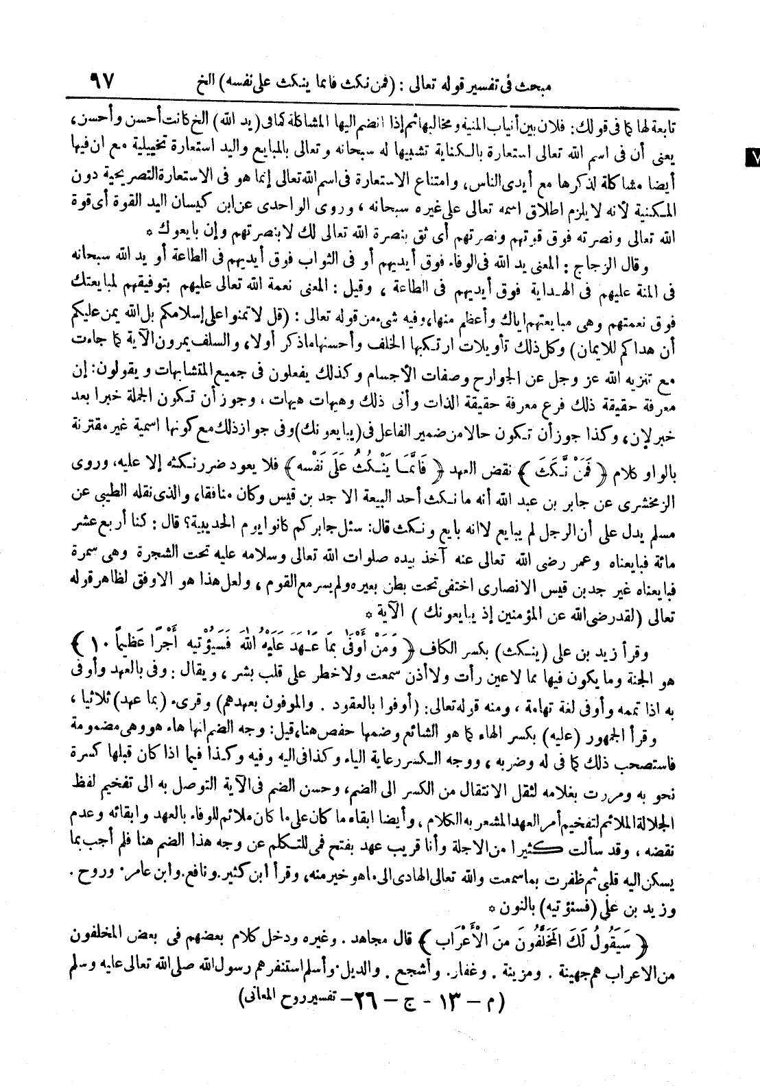 وقال الزجاج : المعنى يد الله في الوفاء فوق أيديهم أو في الثواب فوق أيديهم في الطاعة أو يد الله سبحانه في المنة عليهم في الهداية فوق أيديهم في الطاعة وقيل : المعنى نعمة الله تعالى عليهم بتوفيقهم لمبايعتك فوق نعمتهم وهي مبايعتهم إياك منها وفيه شيء من قوله تعالى : قل لا تمنوا علي إسلامكم بل الله يمن عليكم أن هداكم للإيمان وكل ذلك تأويلات ارتكبها الخلف وأحسنها ما ضكر أولا والسلف يمرون الآية كما جاءت مع تنزيه الله عز و جل عن الجوارح وصفات الأجسام وكذلك يفعلون في جميع المتشابهات ويقولون : إن معرفة حقيقة ذلك فرع معرفة حقيقة الذات وأني ذلك وهيهات هيهات وجوز أن تكون الجملة خبرا بعد خبر لإن وكذا جوز أن تكون حالا من ضمير الفاعل في يبايعونك وفي جواز ذلك مع كونها إسمية غير مقترنة بالواو كلام فمن نكث نقض العهد فإنما ينكث على نفسه فلا يعود ضرر نكثه إلا عليه وروي الزمخشري عن جابر بن عبد الله أنه ما نكث أحد البيعة إلا جد بن قيس وكان منافقا والذي نقله الطيبي عن مسلم يدل على أن الرجل لم يبايع لا أنه بايع ونكث قال : سئل جابر كم كانوا يوم الحديبية قال : كنا أربع عشر مائة فبايعناه وعمر رضي الله تعالى عنه آخذه بيده صلوات الله تعالى وسلامه عليه تحت الشجرة وهي سمرة فبايعناه غير جد بن قيس الأنصاري اختفى تحت بطن بعيره ولم يسر مع القوم ولعل هذا هو الأوفق لظاهر قوله تعالى لقد رضي الله عنها المؤمنين إذ يبايعونك الآية