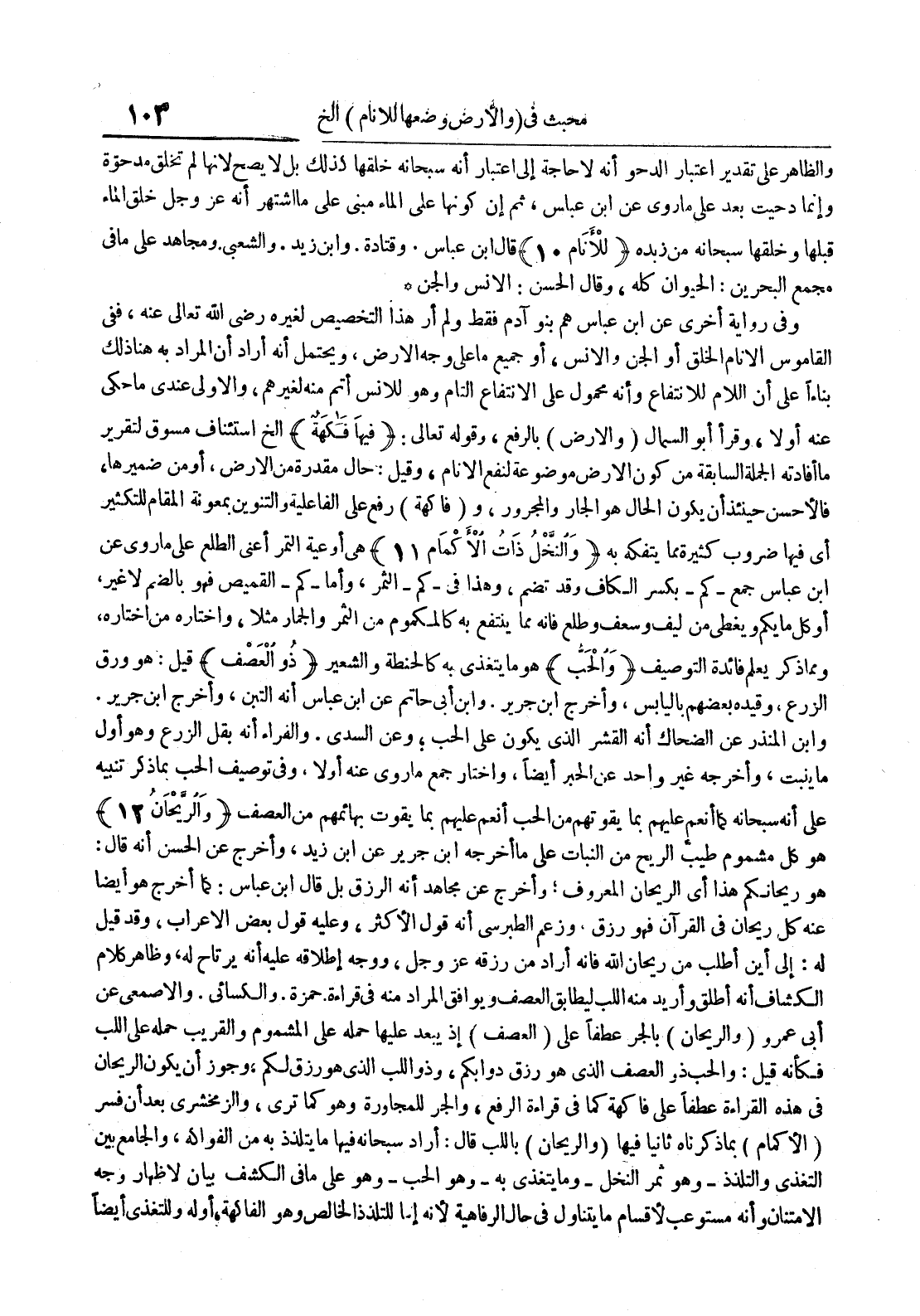 وفي رواية أخرى عن ابنعباس هم بنو آدم فقط ولمأر هذا التخصيص لعيره رضي الله تعالى عنه ففي القاموس الأنام الخلقأو الجن والأنس أو جميع ما على وجه الأرض ويحتمل أنه أراد أن المرادبههنا ذلك بناءاعلى أن اللام للأنتفاع وأنه محمول على الأنتفاع التام وهو للنس أتم منه لغيرهم والأولى عندي ما حكى عنه أولا وقرأأبو السمال والأرض بالرفع وقوله تعالى : فيها فاكهة الخ استئنافمسوق لتقرير ما أفادته الجملة السابقة من كونه الأرض موضوعة لنفع الأنام وقيل : حال مقدرة من الأرض أو من ضميرها فالأحسن حينئذ أن يكون الحال هو الجار والمجرور و فاكهة رفع على الفاعلية والتنوين بمعونة المقام للتكثير أي فيها ضروب كثيرة مما يتفكه به والنخل ذات الأكمام