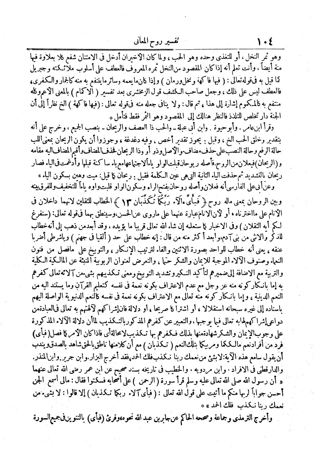 - الخطاب للثقلينلأنهما داخلان في الأنام على ما اخترناه أو لأن الأنام عبارة عنهما علىما روي عن الحسن وسينطق بهما في قوله تعالى : سنفرغ لكم أيهالثقلان وفي الأخبار كما ستعلمه إن شاء الله تعالى قريبا ما يؤيده وقد أبعد من ذهب إلى أنه خطاب للذكر والأنثى من بني آدم وأبعد أكثر منه من قال : إنه خطاب على حد ألقيا في جهنم ويا شرطي أضربا عنقه يعني أنه خطاب للواحدبصورة الأثنين والفاء لترتيب الإنكار والتوبيخ على ما فصل من فنون النعمان وصنوف الآلاء الموجبة للأيمان والشكر حتما والتعرض لعنوان الربوبية المنبئة عن المالكية الكلية والتربية مع الإضافة إلى ضميرهم لتأكيد النكير وتشديد التوبيخ ومعنى تكذيبهم بشيء من آلائه تعالى كفرهم به إما بإنكار كونهمنه عز و جل مع عدم الأعتراف بكونه نعمة فينفسه كتعليم القرآنوما يستند إليه من النعم الدينية وإما إنكار كونه منه تعالآمع الأعتراف بكونه نعمة في نفسه كالنعم الدنيوية الواصلة إليهم بإسناده إلى غيره سبحانه استقلالا أو اشتراكا صريحا أو دلالة فإن إشراكهم لآلهتهم به تعالى في العبادة من دواعي إشراكهم لها به تعالى فيما يوجبها والتعبير على كفرهم المذكور بالتكذيب لما أن دلالة الآلاء المذكورة على وجوب الإيمان والشمر شهادة منها بذلك فكفربها فكفرهم بها تكذيب لا محالة أي فإذا كان الأمر كما فصل فبأي فرد من أفراد نعم ما لككما ومربيكما بتلك النعم تكذبان مع أن كلا منها ناطق بالحق شاهد بالصدق ويندب أن يقول سامع هذه الآية : لا بشيء من نعمك ربنا نكذب فلك الحمد فقد أخرج البزاز وابن جرير وابن المنذر والدارقطني في الأفراد وابن مردويه والخطيب في تاريخه بسند صحيح عن ابن عمر رضي الله تعالى عنهما أن رسول الله صلى الله تعالى عليه وسلم قرأسورة الرحمن على أصحابه فسكتوا فقال : مالي أسمع الجن أمحسن جوابامنكم ما أتيت على قول الله تعالى : فبأي آلاء ربكما تكذبان إلا قالوا : لا بشيء من نعمتك ربنا نكذب فلك الحمد