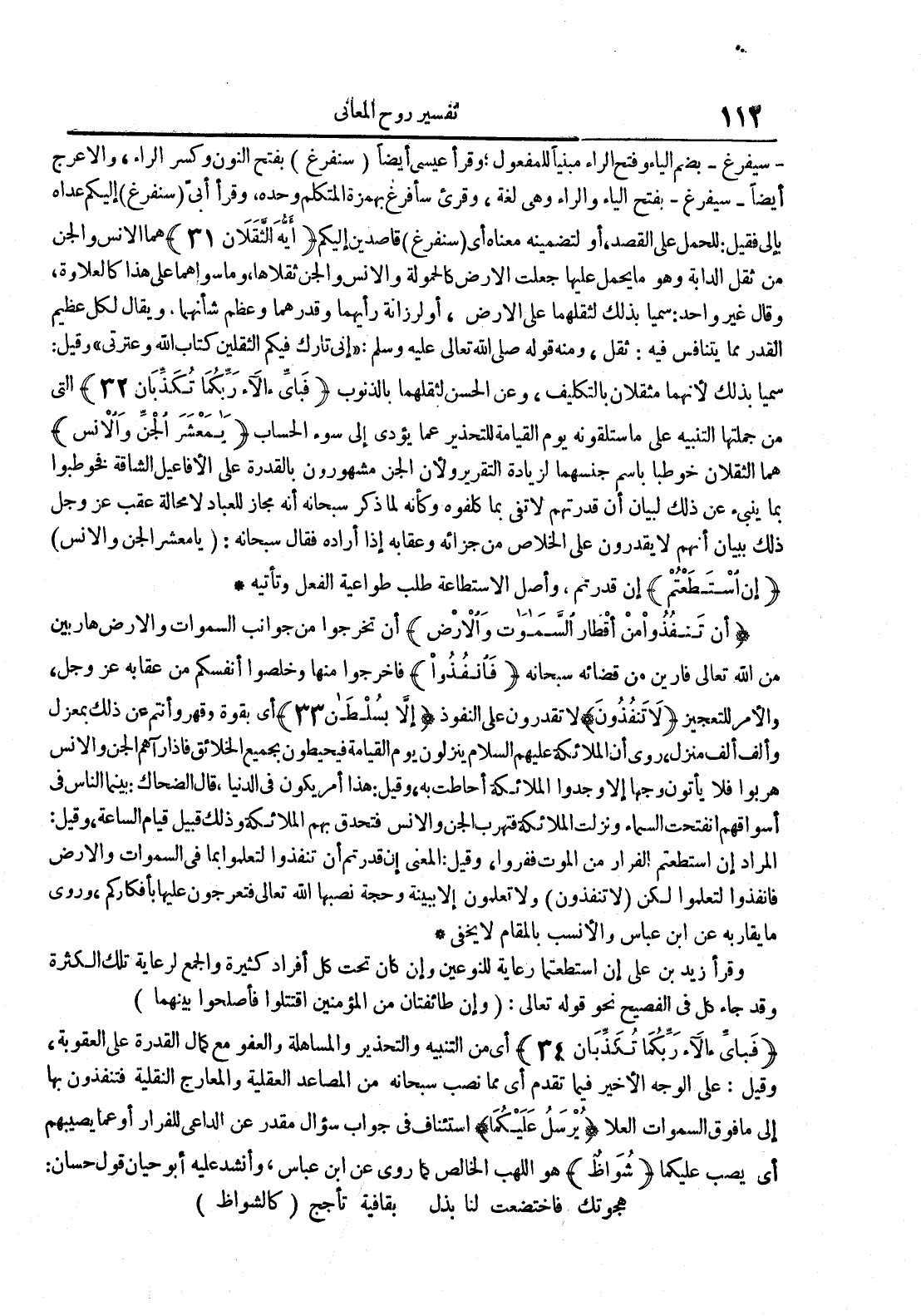 - أي من التنبيه والتحذير والمساهلة والعفو مع كمال القدرة على العقوبة وقيل : على الوجه الأخير فيما تقدم أيمما نصب سبحانه من المصاعد العقلية والمعارج النقلية فتنفذون بها إلى ما فوق السماوات العلا يرسل عليكما استئناف في جواب سؤال مقدر عن الداعي للفرار أو عما يصيبهم أي يصب عليكما شواظ هو اللهب الخالص كما روي عن ابن عباس وأنشد عليه أبو حيان قول حسان : هجوتك فاختضعت لنا بذل بقافية تأجج كالشواظ