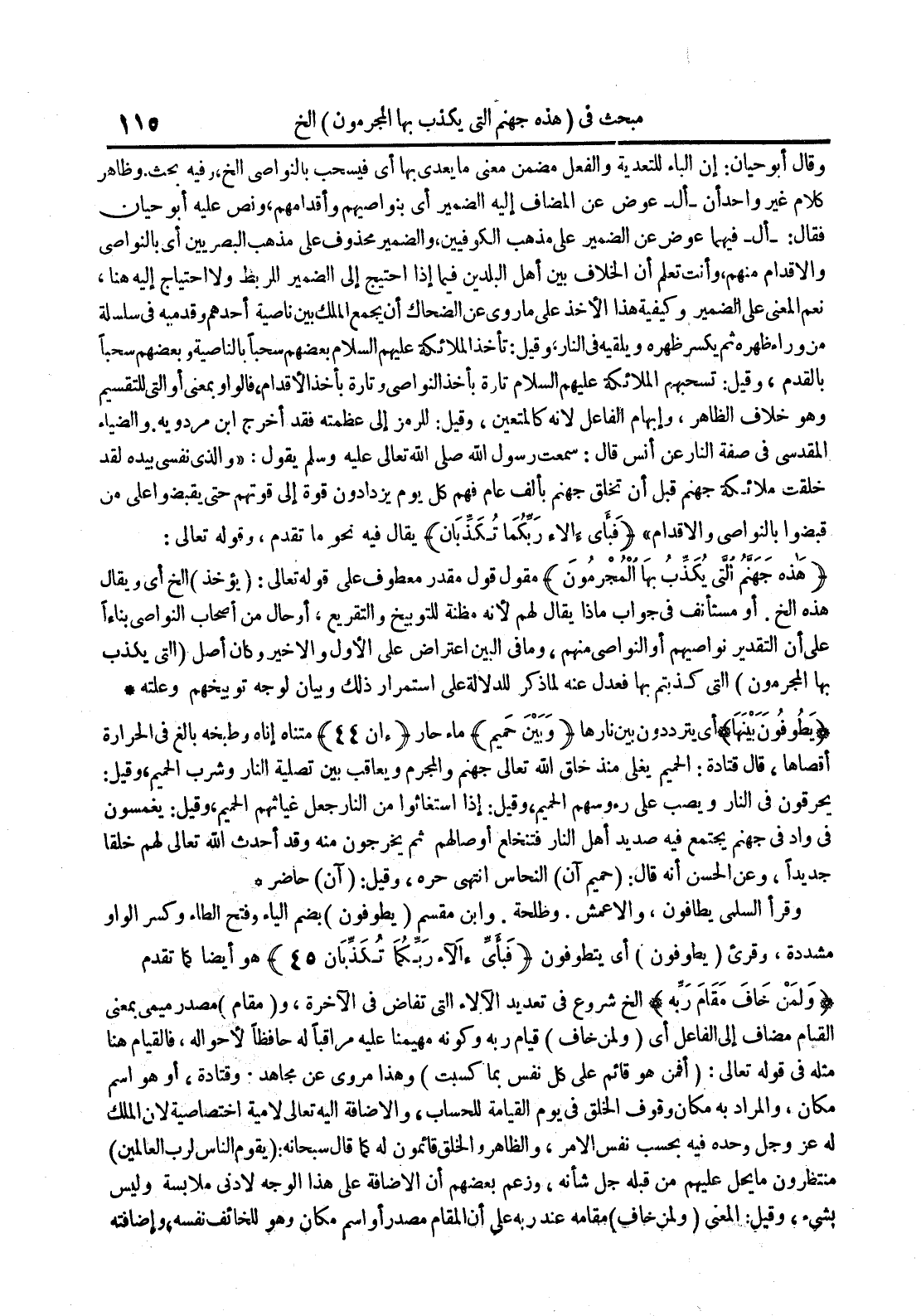 وقالأأبو حيان : إن الباء للتعدية والفعل مضمن معنى ما يعدي بها أي فيسحب بالنواصي الخ وفيه بحث وظاهر كلام غير واحد أن أل عوض عن المضافإليه الضمير أي بنواصيهم وأقدامهم ونص عليه أبو حيان فقال : أل فيهما عوض عن الضمير على مذهب الموفيين والضمير محذوف على مذهب البصريين أي بالنواصي والأقدام منهم وأنت تعلم أن الخلافبين أهل البلدين فيما إذا احتيج إلى الضميرالمربط ولا احتياج إليه هنا نعم المعنى على الضمير وكيفية هذا الأخذ على ما روي عن الضحاك أن يجمع الملك بين ناصية أحدهم وقدميهفي سلسلة من وراء ظهرهثم يكسر ظهرهويلقيه في النار وقيل : تأخذالملائكة عليهم السلام بعضهم سحبابالناصية وبعضهم سحبا بالقدم وقيل : تسحبهم الملائكة عليهم السلام تارة بأخذالنواصي وتارة بأخذالأقدام فالواو بمعنى أو التي للتقسيم وهو خلاف الظاهر وإبهام الفاعل لأنه كالمتعين وقيل : للرمز إلى عظمتهفقد أخرج ابن مردويه والضياء المقدسي في صفة النار عن أنس قال : سمعت رسول الله صلى الله تعالى عليه وسلم يقول : والذي نفسي بيده لقد خلقت ملائكة جهنم قبل أن تخلق جنهم بألف عام فهم كل يوم يزدادون قوة إلى قوتهم حتى يقبضوا على من قبضوا بالنواصي والأقدام فبأي آلاء ربكما تكذبان يقال فيه نحو ما تقدم وقوله تعالى : هذه جهنم التي يكذب بها المجرمون مقول قول مقدر معطوف علىقوله تعالى : يؤخذ الخ أي ويقال هذه الخ أو مستأنف في جواب ماذا يقال لهم لأنه مظنة للتوبيخ والتقريع أو حال من أصحاب النواصي بناءا على أن التقدير نواصيهم أو النواصي منهم وما فيالبين اعتراض على الأول والأخير وكان أصل التي يكذب بها المجرمون التي كذبتم بها فعدل عنه للدلالة على استمرار ذلك وبيانلوجه توبيخهم وعلته