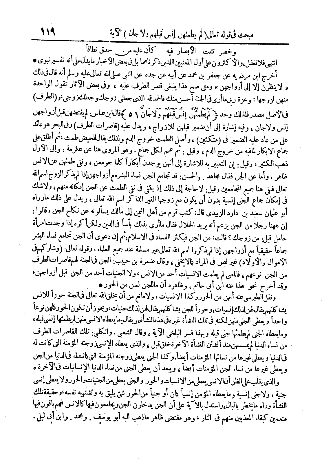 - قال ابن عباس : لم يفتضهن قبل أزواجهن إنس ولا جان وفيه إشارة إلى أن الضمير قبلهن للأزواج ويدل عليه قاصرات الطرف وفيالبحر هو عائدعلى من عادعليهالضمير في متكئين وأصلالطمث خروجالدم ولذلك يقال للحيض طمث ثم أطلق على جماع الأبكار لما فيه من خروج الدم وقيل : ثم عمم لكلجماع وهو المروي هنا عن عكرمة وإلى الأول ذهب الكثير وقيل : إن التعبير به للإشارة إلى أنهن يوجدنأبكارا كلماجومعن ونفي طمثهن عن الأنس ظاهر وأما عن الجن فقال مجاهد والحسن : قدتجامع الجن نساء البشر مع أزواجهن إذا لم يذكر الزوجاسم الله تعالى فنفي هنا جميع المجامعين وقيل : لا حاجة إلى ذلكإذ يكفي في نفي الطمث عن الجن إمكانهمنهم ولا شك في إمكان جماع الجني إنسية بدون أن يكومع زوجها الغير الذاكر اسم الله تعالى ويدل على ذلك ما رواه أبو عثمان سعيد بن داود الزبيدي قال : كتب قوممن أهل اليمن إلى مالك يسألونهعن نكاح الجن وقالوا : إن ههنا رجلامن الجن يزعم أنه يريد الحلال فقال ما أرى بذلكبأسأفي الدين ولكن أكره إذاوجدت امرأةحامل قيل : من زوجك قالت : من الجن فيكثر الفساد في الإسلام ثم إن دعوى أن الجن تجامع نساء البشر جماعاحقيقيا مع أزواجهنإذا لم يذكروا اسم الله تعالى غير مسلمة عند جميع العلماء وقوله تعالى : وشاركهم في الموال والأولاد غير نص في المراد كما لا يخفى وقال ضمرة بن حبيب : الجن في الجنة لهم قاصرات الطرف من الجننوعهم فالمعنى لم يطمث النسيات أحدمن الإنس ولا الجنيات أحدمن الجن قبل أزواجهن وقدأخرج نحو هذا عنه ابن أبي حاتم وظاهره أن ما للجن لسنمن الحور