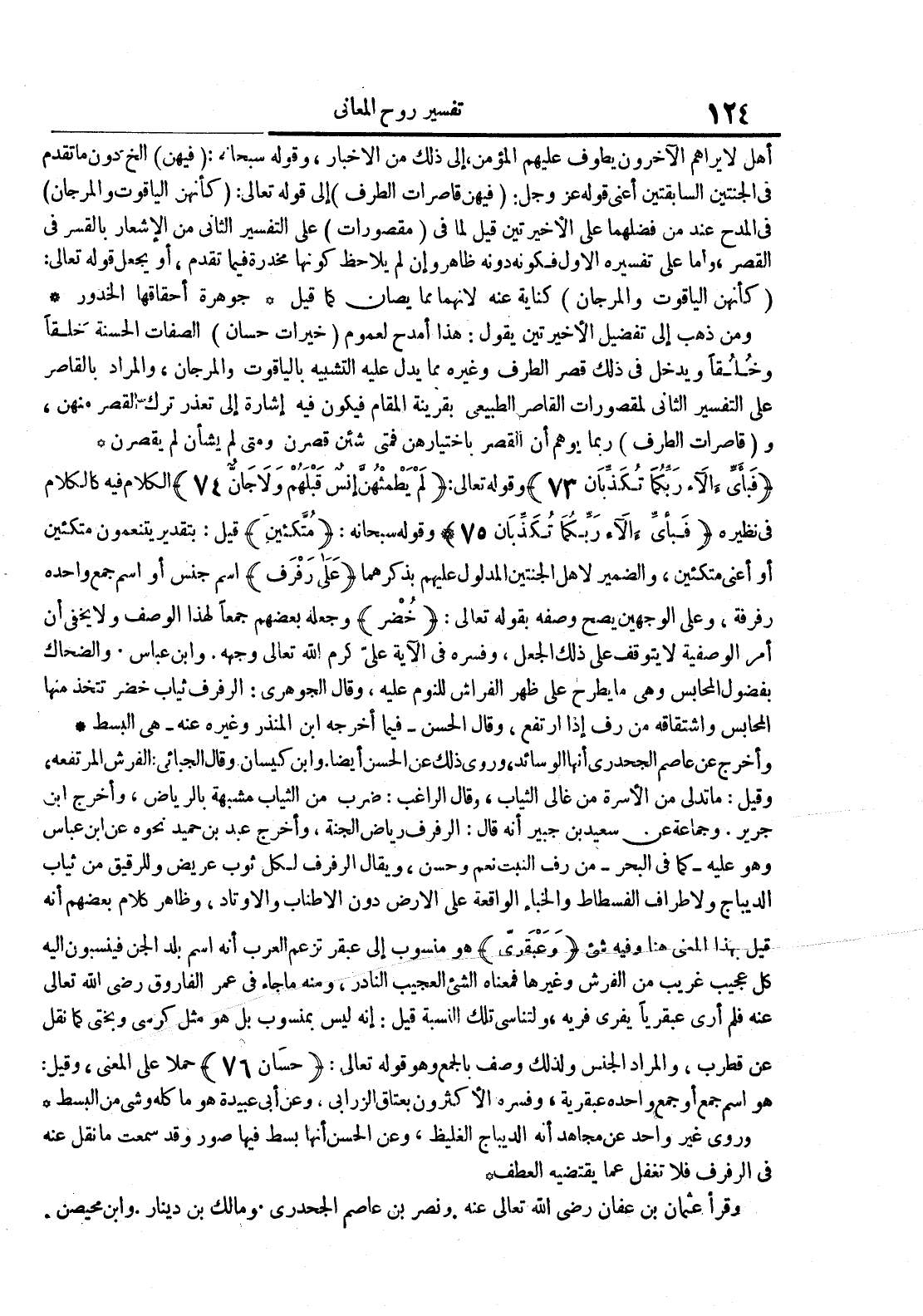 - وقوله سبحانه : متكئين قيل : بتقدير يتنعمون متكئين أو أعني متكئين والضمير لأهل الجنتين المدلولعليهم بذكرهما على رفرف اسم جنس أو اسم جمعواحده رفرفة وعلى الوجهينيصح بقوله تعالى : خضر وجعله بعضهمجمعالهذا الوصف ولا يخفى أن أمر الوصفية لا يتوقف على ذلك الجعل وفسره في الآية علي كرم الله تعالىوجهه وابن عباس والضحاك بفضول المحابس وهي ما يطرح على ظهر الفراش للنوم عليه وقال الجوهري : الرفرف ثياب خضر تتخذ منها المحابسواشتقاقه من رف إذا ارتفع وقال الحسن فيما أخرجه ابن المنذر وغيره عنه هيالبسط