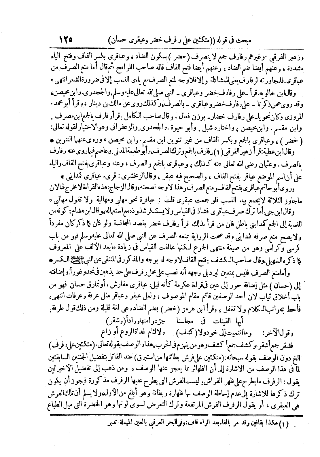 ورهبر الفرقبي وغيرهم رفارف جمع لا ينصرف حضر بسكون الضاد وعباقري بكسر القاف وةفتح الياء مشددة وعنهم أيضاضم الضاد وعنهم أيضا فتح القاف قاله صاحب اللوامح ثم قال أما منع الصرف من عباقري فلمجاورته لرفارفللمشاكلة وإلا فلا وجه لمنعالصرف مع ياءيالنسبإلا في ضرورة الشعر انتهى