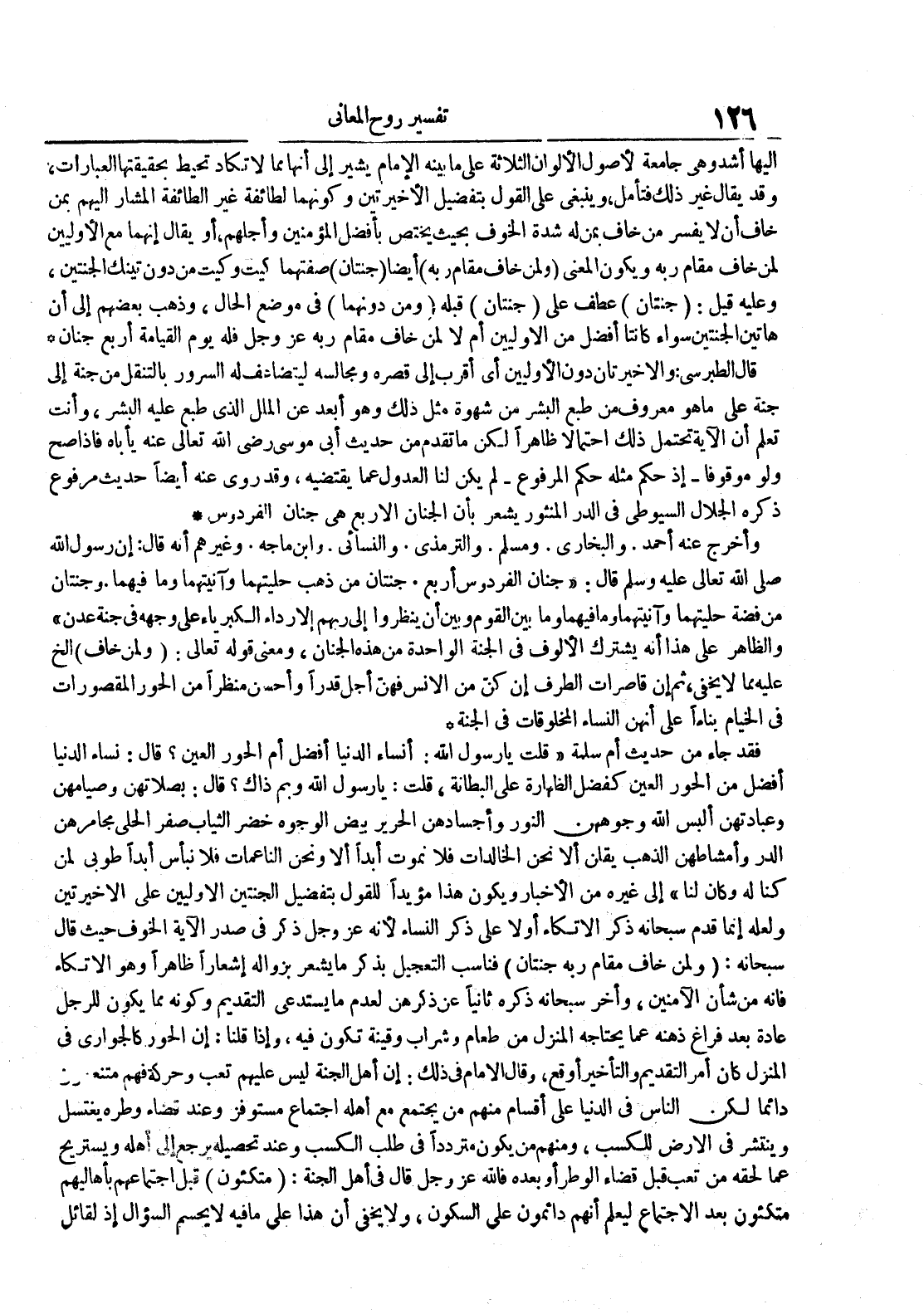 فقد جاء من حديث أم سلمة قلت يا رسول الله : أنساء الدنيا أفضل أم الحور العين قال : نساء الدنيا أفضل من الحور العين كفضل الظهارة على البطانة قلت : يا روبم ذاك قال : بصلاتهن وصيامهن وعبادتهن ألبس الله وجوههن النور وأجسادهن الحرير بيض الوجوه خضر الثياب صفر الحلي مجامرهن الدر وأمشاطهن الذهب يقلن ألا نحن الخالدات فلا نموت أبداألاونحن الناعمات فر نبأس أبداطوبى لمن كنا له وكان لنا إلى غيره من الأخبار ويكون هذا مؤيداللقول بتفصيل الجنتين الأوليين على الأخيرتين ولعله إنما تقدم سبحانه ذكر الأتكاء أولا على ذكر النساء لأنه عز و جل ذكر في صدر الآية الخوف حيث قال سبحانه : ولمنخاف مقام ربه جنتان فناسب التعجيل بذكر ما يشعر بزواله إشعاراظاهرا وهو الإتكاء فإنه من شأن الآمنين وأخر سبحانه ذكره ثانيا عن ذكرهن لعدم ما يستدعي التقديم وكونه مما يكون للرجل عادة بعد فراغ ذهنه عما يحتاجه المنزلمن طعام وشراب وقينة تكون فيه وإذا قلنا : إن الحور كالجواري في المنزل كان أمر التقديم والتأخير أوقع وقال الإمام في ذلك : إن أهل الجنة ليس عليهم تعب وحركة فهم متنعمون دائما لكن الناس في الدنيا على أقسام منهم من يجتمع مع أهله اجتماع مستوفز وعند قضاء وطره يغتسل وينتشر في الأرض للكسب ومنهم من يكومترددافي طلب الكسب وعند تحصيله يرجع إلى أهله ويستريح عما لحقه من تعب قبل قضاء الوطر أو بعده فلله عز و جل قال في أهل الجنة : متكئون قبل اجتماعهم بأهاليهم متكئون بعدالأجتماعليعلم أنهم دائمون على السكون ولا يخفى أن هذاعلى ما فيه لا يحسم السؤال إذ لقائل