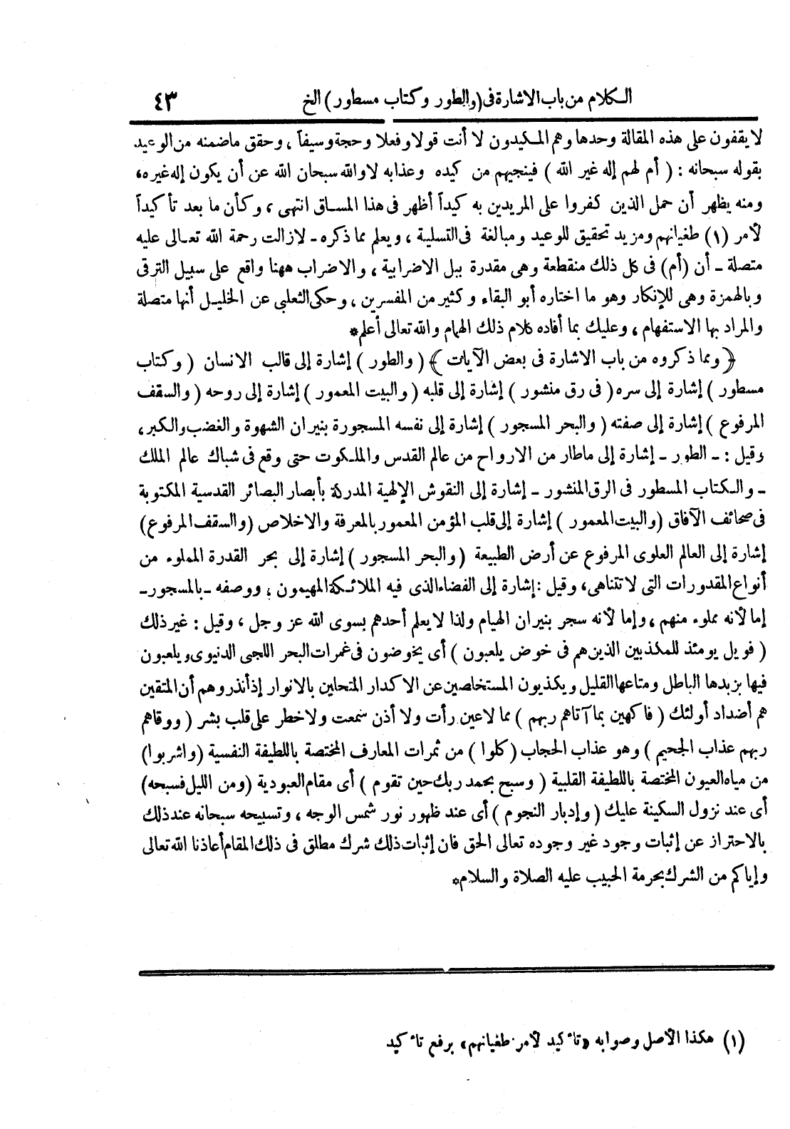 ومما ذكروه من باب الإشارة في بعض الآيات والطور إشارة إلى قالب الإنسان وكتاب مسطور إشارة إلى سره فيرق منشور إشارة إلى قلبه والبيت المعمور إشارة إلى روحه والسقف المرفوع إشارة إلى صفته والبحر المسجور إشارة إلى نفسه المسجورة بنيران الشهوة والغضب والكبر وقيل : الطور إشارة إلى ما طار من الأرواح من عالم القدس والملكوت حتى وقع في شباك عالم الملك والكتاب المسطور في الرق المنشور إشارة إلى النقوش الإلهية المدركة بأبصار البصائر القدسية المكتوبة في صحائفالآفاق والبيت المعمور إشارة إلى قلب المؤمن المعمور بالمعرفة والإخلاص والسقف المرفوع إشارة إلى العالم العلوي المرفوع عن أرض الطبيعة والبحر المسجور إشارة إلى بحر القدرة المملوء منأنواع المقدرات التي لا تتناهى وقيل : إشارة إلى الفضاء الذي فيه الملائكة المهيمون ووصفه بالمسجور إما لأنه مملوء منهم وإما لأنه سجر بنيران الهيام ولذا لا يعلم أحدهم بسوى الله عز و جل وقيل : غير ذلك فويل يومئذ للمكذبين الذين هم في خوض يلعبون أي يخوضون في غمرات البحر اللجي الدنيوي ويلعبونفيها بزبدها الباطل ومتاعها القليل ويكذبون المستخلصين عن الأكدار المتحلين بالأنوار إذى أنذروهم أن المتقين هم أضداد أولئك فاكهين بماآثارهمربهم مما لا عين رأت ولا أذن سمعت ولا خطر على قلب بشر ووقاهم ربهم عذاب الجحيم وهو عذاب الحجاب كلوا من ثمرات المعارف المختصة باللطيفة النفسية وأشربوا من مياه العيون المختصة باللطيفة القلبية وسبح بحمد ربك حين تقوم أي مقام العبودية ومن الليل فسبحه أيعند نزول السكينة عليك وإدبار النجوم أي عند ظهور نور شمس الوجه وتسبيحه سبحانه عند ذلك بالأحتراز عن إثبات وجود غير وجوده تعالى الحق فإن إثبات ذلك شرك مطلق في ذلك المقام أعاذنا الله تعالى وإياكم من الشرك بحرمة الحبيب عليه الصلاة و السلام