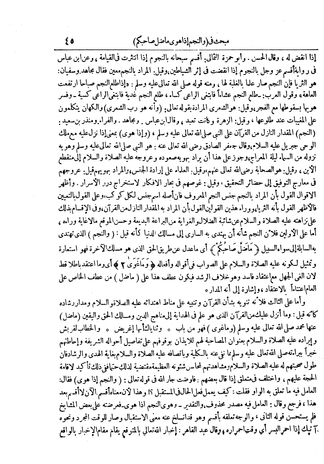 إذا انقض له وقالالحسن وأبو حمزة الثمالي : وأقسم سبحانه بالجوم إذاانتثرت في القيامة وعن ابن عباسفي رواية أقسم عزوجل بالنجوم إذاانقضت في إثر الشياطين وقيل : المراد بالنجم معين فقالأ مجاهد وسفيان : هوالثريا فإن النجم صار علما بالغلبة لها ومنه قوله ص - : إذاطلع النجم صباحاارتفعت العاهةوقول العرب : طلع النجم عشاءا فابتغى الراعي كساء طلع النجم غدية فابتغى الراعي كسيةوفسرهويها بسقوطها مع الفجر وقيل : هو الشعري المرادة بقوله تعالى : وأنه هو رب الشعري والكهانيتكلمون على المغيبات عند طلوعها وقيل : الزهرة وكانت تعبد وقال ابن عباس ومجاهد والفراء ومنذر بن سعيد : النجم المقدر النازل من القرآن على النبي ص - وإذا هوى بمعنى إذا نزل مع ملك الوحي جبريل عليه الصلاة و السلام وقال جعفر الصادق رضي الله تعالى عنه : هو النبي صلى الله تعالى عليه وسلم وهويه نزوله من السماء ليلة المعراج وجوز على هذا أن يراد بهويه صعودهوعروجه عليه الصلاة و السلام إلى منقطع الأين وقيل : هو الصحابة رضي الله تعالى عنهم وقيل : العلماء على إرادة الجنس والمراد بهويهم قيل : عروجهم في معارج التوفيق إلى حضائر التحقيق وقيل : غوصهم في بحار الأفكار لاستخراج دررالأسرار وأظهر الأقوال القولبأن المراد بالنجم جنس المعروف فإن أصله اسم جنس لكل كوكب وعلى القول بالتعيين فالأظهر القول بأنه الثريا وراء هذين القولين القول بأن المراد به المقدار النازل من القرآن وفي الإقسام بذلك على نزاهته عليه الصلاة و السلام عن شائبة الضلال والغواية من البراعة البديعة وحسن الموقع ما لا غاية وراءه أما على الأولين فلأن النجم شأنه أن يهتدي به الساري إلى مسالك الدنيا كأنه قيل : والنجم الذي تهتدي به السابلة إلى سواء السبيل ما ضل صاحبكم أي ما عدل عن طريق الحق الذي هو مسلك الآخرةفهو استعار وتمثيل لكونه عليه الصلاة و السلام على الصواب في أقواله وأفعاله وماغوى