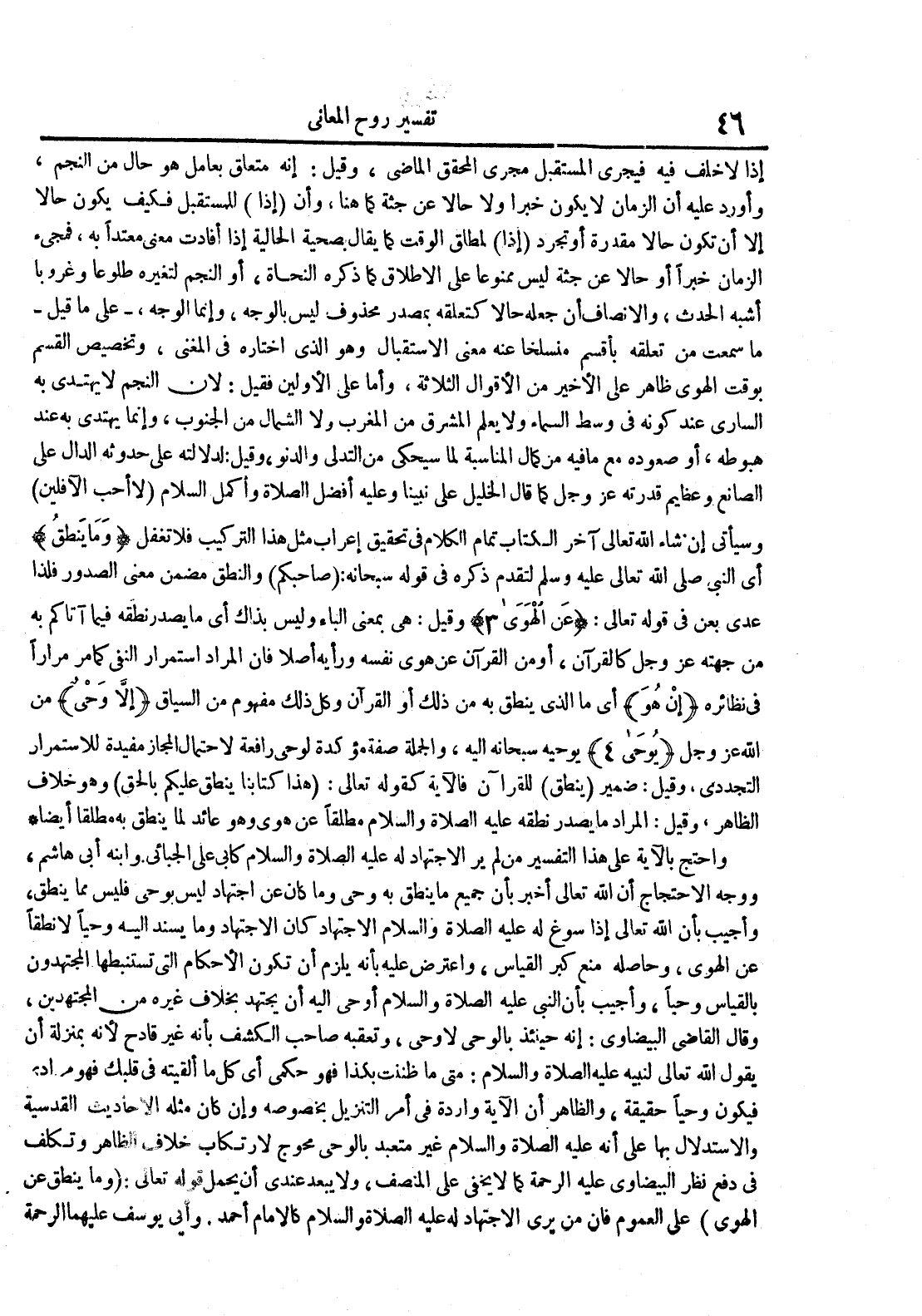 واحتج بالآية على هذا التفسير من لم ير الأجتهاد له عليهالصلاة والسلام كأبي علي الجبائي وابنه أبي هاشم ووجه الأحتجاج أن اللهتعالى أخبر بأن جميع ما ينطق بهوحي وما كان عن اجتهاد ليس بوحي فليس مماينطق وأجيب بأن الله تعالآإذا سوغ له عليه الصلاة و السلام الأجتهاد كان وما يسند إليه وحيالا نطقا عن الهوى وحاصله منع كبر القياس واعترض عليه بأنه يلزم أن تكون الأحكام التي تستنبطها المجتهدون بالقياس وحيا وأجيب بأن النبي عليه الصلاة و السلام أوحي إليه أن يجتهد بخلاف غيره من المجتهدين وقال القاضي البيضاوي : إنه حينئذ بالوحي لا وحي وتعقبه صاحب الكشف بأنه غير قادح لأنه بمنزلة أن يقول الله تعالى لنبيه عليه الصلاة و السلام : متى ما ظننت بكذا فهو حكمي أي ما ألقيته في قلبك فهو مردي فيكون وحياحقيقة والظاهر أن الآية واردة في أمر التنزيل بخصوصه وإن كان مثله الأحاديثالقدسية والأستدلال بها على أنه عليه الصلاة و السلام غير متعبد بالوحي محوج لارتكاب خلاف الظاهر وتكلففي دفع نظر البيضاوي عليه الرحمة كما لا يخفى على المنصف ولا يبعدعندي أن يحمل قوله تعالى : وما ينطلق عن الهوى على العموم فإن من يرى الأجتهاد له عليه الصلاة و السلام كالإمام أحمد وأبي يوسف عليهما الرحمة