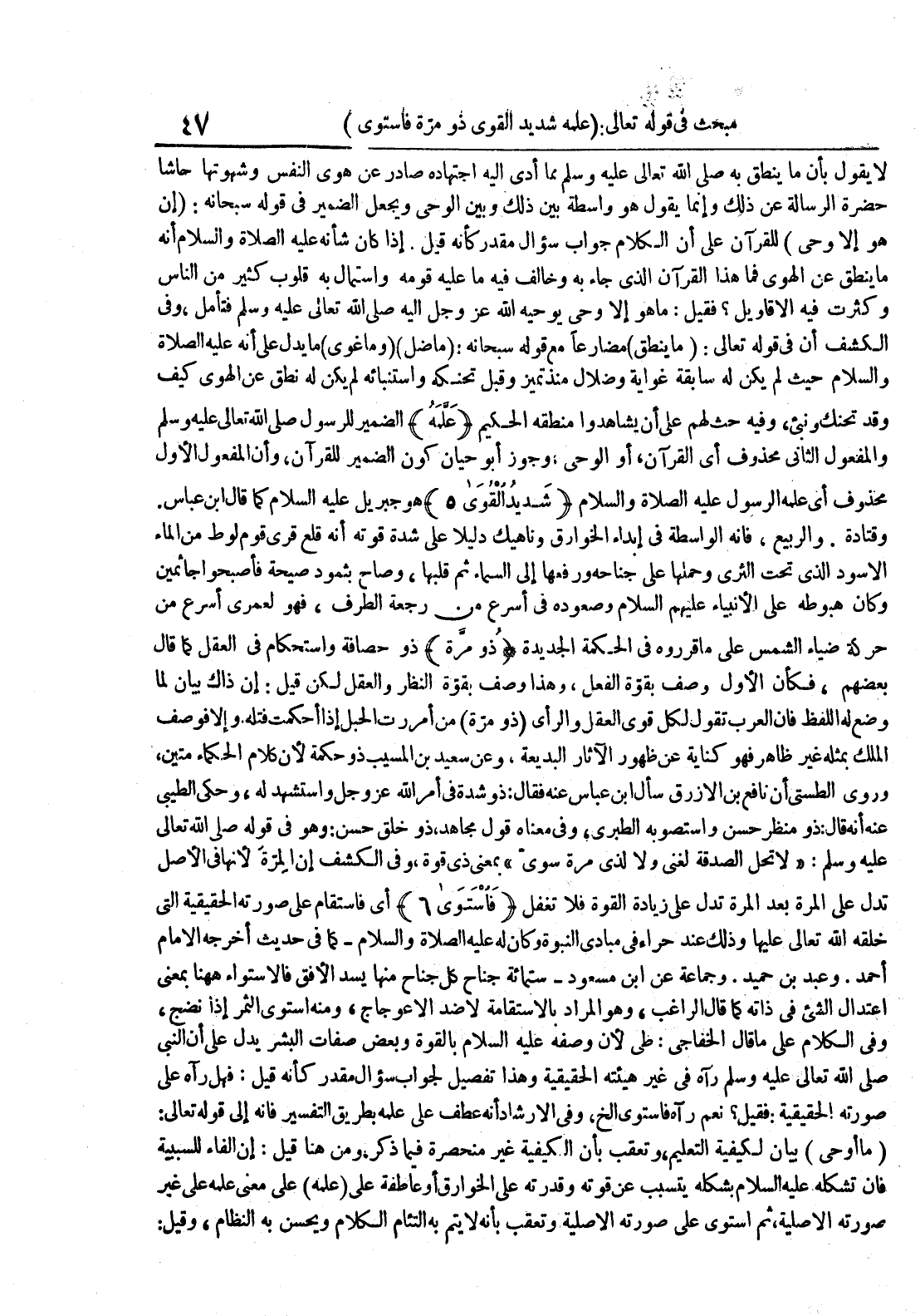 - هو جبريل عليه السلام كما قال ابن عباس وقتادة والربيع فإنهالواسطة في إبداء الخوارق وناهيك دليلا على شدة قوته أنه قلع قرى قوم لوط من الماء الأسود الذي تحت الثرى وحملها علىجناحه ورفعها إلى السماءثم قلبها وصاح بثمود صيحة فأصبحوا جاثمين وكان هبوطه على الأنبياء عليهم السلام وصعوده في أسرع من رجعة الطرف فهو لعمري أسرع من حركة ضياء الشمس على ماقرروه في الحكمة الجديدة ذومرة ذوحصافة واستحكام في العقل كما قال بعضهم فكأن الأول وصف بقوة الفعل وهذا وصف بقوة النظر والعقل لكن قيل : إن ذاك بيان لما وضع اللفظ فإن العرب تقول لكل فوي العقل والرأي ذو مرة من أمررت الحبل إذاأحكمت فتله وإلا فوصف الملك بمثله ظاهر فهو كناية عن ظهور الآثار البديعة وعن سعيد بن المسيب ذوحكمة لأن كلام الحكماء متين وروي الطستي أن نافع بن الأزرق سأل ابن عباس عنه فقال : ذو شدة في أمر الله عز و جل واستشهد له وحكى الطيبي عنه أنهقال : ذو منظر حسن واستصو به الطبري وفي معناه قول مجاهد ذو خلق حسن : وهو في قوله صلى الله تعالى عليه وسلم : لا تحل الصدقة لغني ولالذي مرة سوى بمعنى ذي قوة وفي الكشف إن المرة لأنها في الأصل تدلعلى المرة بعد المرة تدل على زيادة القوة فلا تغفل فاستوى
