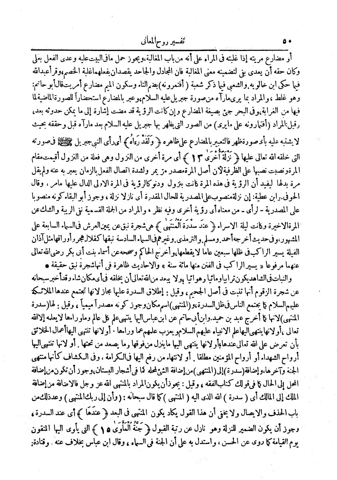 والنبات في الشاهد يكون ترابيا ومائيا وهوائيا ولا يبعد من الله تعالى أن يخلقه في أي مكان شاء وقد أخبر سبحانه عن شجرة الزقوم أنها تنبت في أصلالجحيم وقيل : إطلاقالسدرة عليها مجاز لأنها تجتمع عندها الملائكة عليهم السلام كما يجتمع الناس فيظل السدرة و المنتهى اسم مكان وجوز كونه مصدراميميا وقيل : لها سدرة المنتهى لأنها كما أخرج عبد بن حميد وابن أبي حاتم عن ابن عباس إليها ينتهي علم كل عالم وما وراءها لا يعلمه إلا الله تعالى أو لأنها ينتهي إليها علم الأنبياءعليهم السلام ويعزب علمهم عما وراءها أو لأنها تنتهي إليها أعمال الخلائق بأن تعرض على الله تعالى عندها أو لأنها ينتهي إليها ما ينزل من فوقها وما يصعد من تحتها أو لأنها تنتهي إليها أرواح الشهداء أو أرواح المؤمنين مطلقاأو لانتهاء من رفع إليها في الكرامة وفي الكشاف كأنها منتهى الجنة وآخرها وإضافة سدرة إلى المنتهى من إضافة الشيء لمحله كما في أشجار البستان وجوز أن تكون من إضافة المحل إلى الحال كما في قولك كتاب الفقه وقيل : يجوز أن يكون المراد بالمنتهى الله عز و جل فالإضافة من إضافة الملك إلى المالك أي سدرة الله الذي إليه المنتهى كما قال سبحانه : وأن إلى ربك المنتهى وعد ذلك من باب الحذف والأيصالأ ولا يخفى أن هذا القول يكاد يكون المنتهى في البعد عندنا أي عند السدرة وجوز أن يكون الضمير للنزلة وهونازل عن رتبة القبول جنة المأوى