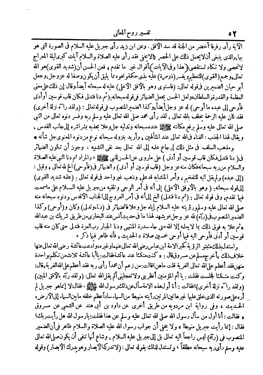 واستدل بذلك مثبتو الرؤية كحبرالأمةابن عباس رضي الله تعالى عنهما وغيره وادعت عائشة رضي الله تعالى عنها خلاف ذلك أخرج مسلم عن مسروق قال : كنت متكئا عند عائشة فقالت : يا أبا عائشةثلاث من تكلم بواحدة منهن فقد أعظم على الله تعالىالفرية قلت ما هن قالت : من زعم أن محمدا رأى ربه فقد أعظم على الله الفرية وقال : وكنت متكئا فجلست فقلت : يا أم المؤمنين أنظريني ولا تعجليني ألم يقل الله تعالى : ولقد رآه بالأفق المبين ولقد رآه نزلة أخرى فقالت : أنا أول هذه الأمة عن ذلك رسول الله صلى الله عليه و سلم فقال : لا إنما هو جبريل لم أره على صورته اليذ خلق عليها غير هاتين المرتين رأيته منهبطا من السماء سادا عظم خلقه ما بين السماء إلى الأرض الحديث وفي رواية ابن مردويه من طريق أخرى عن داود بن أبي هند عن الشعبي عن مسروق فقالت : أنا أول من سألأر صلى الله تعالى عليه وسلم عن هذافقلت : يا رسول الله هل رأيت ربك فقال : إنما رأيت جبريل منهبطا ولا يخفى أن جواب رسول الله عليه الصلاة و السلام ظاهر في أن الضمير المنصوب في رآه ليس راجعا إليه تعالى بل إلى جبريل عليه السلام وشاع أنها تنفي أن يكون صلى الله تعالى عليه وسلم رأى ربه سبحانه مطلقا وتستدل لذلك بقوله تعالى : لا تدركه الأبصار وهو يدرك الأبصار وقوله