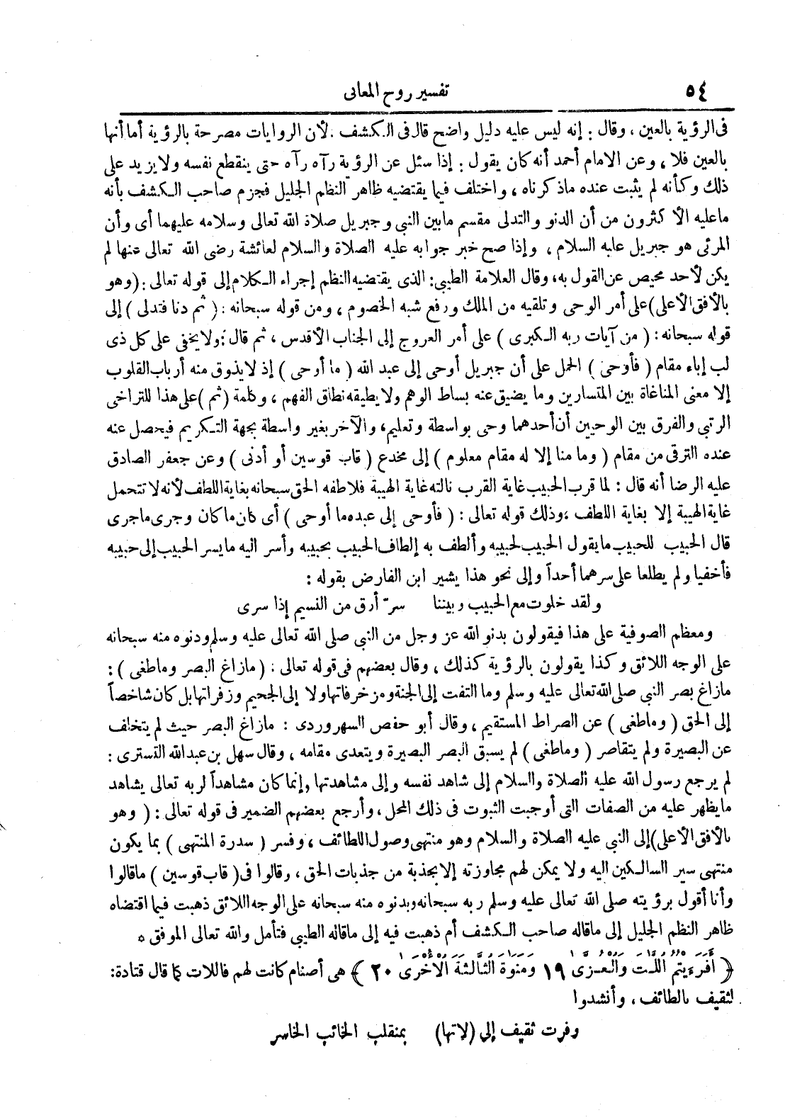 في الرؤية بالعين وقال : إنهليس عليه دليل واضح قال في الكشف : لأنالروايات مصرحة بالرؤية أما أنها بالعين فلا وعن الإمامأحمد أنهكانيقول : إذاسئلعن الرؤيةرآهرآه حتى ينقطع نفسه ولا يزيد على ذلك وكأنه لم يثبت عنده ما ذكرناه واختلف فيما يقتضيه ظاهر النظم الجليل فجزمصاحبالكشف بأنه ما عليه الأكثرون من أن الدنو والتدلي مقسمما بين النبي وجبريلصلاة الله تعالىوسلامه عليهماأي وأن المرئيهو جبريلعليه السلام وإذاصح خبر جوابه عليه الصلاة و السلاملعائشة رضي الله تعالى عنهالم يكن لأحد محيص عن القول به وقالالعلامةالطيبي : الذييقتضيه النظمإجراء الكلام إلىقوله تعالى : وهو بالأفق الأعلى على أمر الوحي وتلقيهمن الملك ورفعشبهالخصوم ومن قوله سبحانه : ثم دنافتدلى إلى قولهسبحانه : من آيات ربه الكبرى على أمر العروج إلىالجانب الأقدس ثم قال : ولا يخفىعلى كل ذي لب إباءمقام فأوحى الحمل على أن جبريلأوحى إلى عبد الله ما أوحى إذ لا يذوق منه أربابالقلوبإ معنى المناغاةبين المتساويين وما يضيق عنه بساط الوهمعنه ولا يطيقهنطاق الفهم وكلمة ثم على هذا للتراخيالرتبيوالفرق بين الوحيينأن أحدهما وحي بواسطة وتعليم والآخر بغير واسطةبجهة التكريم فيحصلعنه عندهالترقيمن مقام وما مناإلا له مقام معلوم إلى مخدع قابقوسينأو أدنى وعن جعفر الصادق عليه الرضاأنه قال : لما قرب الحبيب غاية القرب نالته غاية الهيبة فلاطفه الحق سبحانه بغاية اللطف لأنهلا تتحمل غاية الهيبة إلا بغاية اللطف وذلك قوله تعالى : فأوحى إلى عبده ما أوحى أي كانما كان وجرى ما جرىقال الحبيب للحبيب ما يقولالحبيب لحبيبه وألطف به إلطاف الحبيب بحبيبهوأسر إليه ما يسر الحبيب إلى حبيبه فأخفيا ولم يطلعا على سرهما أحدا وإلى نحوهذا يشيرابن الفرض بقوله : ولقد خلوتمع الحبيب وبيننا سرادق من النسيم إذا سرى ومعظم الصوفية على هذا فيقولون بدنو اللهعز و جل من النبيصص ودونوه منه سبحانه على الوجه اللائق وكذا يقولون بالرؤية كذلك وقال بعضهم في قوله تعالى : ما زاغ البصر وما طغى : ما زاغبصر النبي صلى الله تعالى عليه وسلم وما التفتإلى الجنةومزخرفاتها ولا إلى الجحيم وزفراتها بل كان شاخصا إلى الحق وماطغى عن الصراط المستقيم وقال أبو حفصالسهروردي : ما زاغالبصر حيث لميتخلف عنالبصيرة ولم يتقاصر وما طغى لم يسبق البصر البصيرة ويتعدىمقامه وقال سهل بن عبد الله التستري : لم يرجع رسول الله صلى الله تعالى عليه وسلم إلى شاهد نفسه وإلى مشاهدتها وإنما كان مشاهدا لربه تعالى يشاهد ما يظهر عليه من الصفات التيأوجبتالثبوت في ذلك المحل وأرجع بعضهم الضمير في قوله تعالى : وهو بالأفقالأعلى إلى النبي عليه الصلاة و السلام وهو منتهى وصول اللطائف وفسر سدرة المنتهى بما يكون منتهى سير السالكين إليه ولا يمكن لهم مجاوزته إلا بجذبه من جذبات الحق وقالوا في قاب قوسين ما قالواوأنا أقول برؤيته ص - ربه سبحانه وبدنوه منه سبحانه على الوجه اللائق ذهبت فيما اقتضاه ظاهر النظم الجليل إلى ما قاله صاحب الكشف أم ذهبت فيه إلىما قاله الطيبيفتأمل والله تعالى الموفق