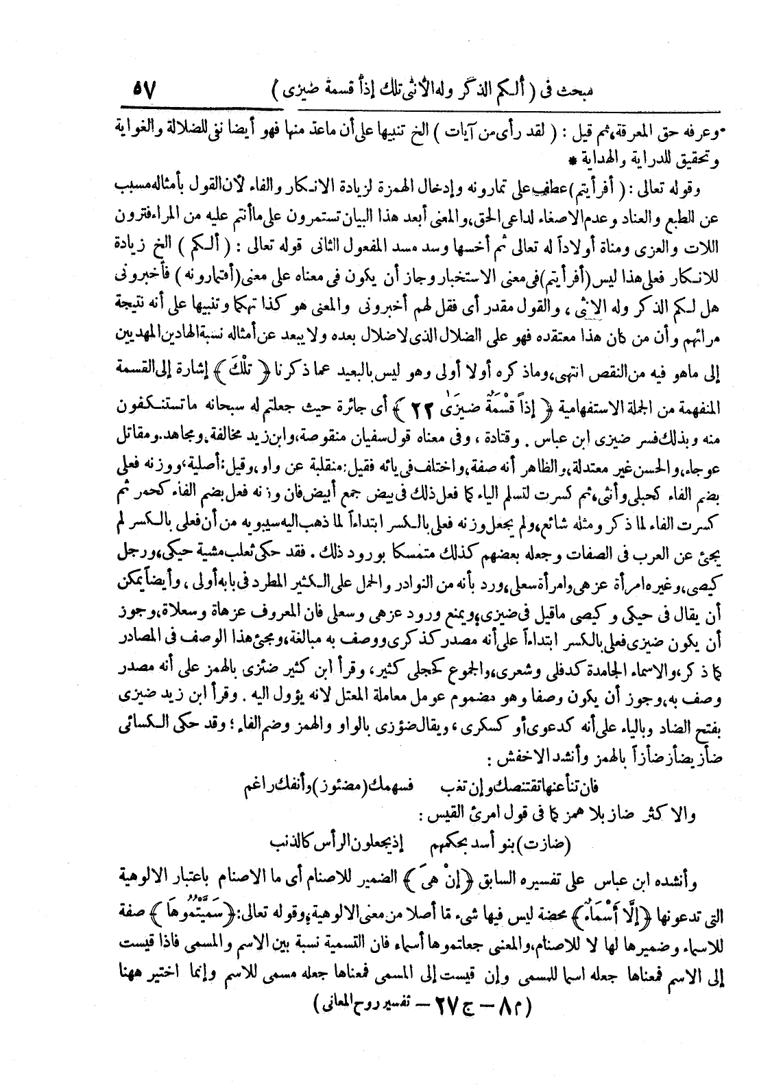 - أي جائرة من حيث جعلتم له سبحانه ما تستنكفون منه وبذلك فسر ضيزي ابن عباس وقتادة وفي معناه قول سفيان منقوصة وابن زيد مخالفة ومجاهد ومقاتل عوجاء والحسن غير معتدلة والظاهر أنه صفة واختلف في ريائه فقيل : منقلبة عن واو وقيل : أصلية ووزنه فعلى بضم الفاء كحبلى وأنثى ثم كسرت لتسليم الياء كما فعل ذلك في بيض جمع أبيض فإن وزنه بضم فعل الفاء كحمر ثم كسرت الفاء لما ذكر ومثله شائع ولم يجعل وزنه فعلى بالكسر ابتداءل لما ذهبإليه سيبويه من أن فعلى بالكسر لميجيء عن العرب في الصفات وجعله بعضهم كذلك متمسكا بورود ذلك فدق حكى ثعلب مشية حيكى ورجل كيصي وغيره امرأة عز هي وامرأة سعلي ورد بأنه من النوادروالحمل على الكثير المطرد في بابه أولى وأيضا يمكن أن يقالأ في حيكى وكيصى ما قيل في ضيزي ويمنع ورود عز هي وسعلى فإن المعروف عزهاة وسعلاة وجوز أن يكون ضيزي فعلى بالكسر ابتداءا على أنه مصدر كذكرى ووصف به مبالغة ومجيء هذا الوصف في المصادر كما ذكر والأسماء الجامدة كدفلي وشعري والجموع كحجلي كثير وقرأ ابن كثير ضيئزي بالهمزعلى أنه مصدروصف به وجوز أن يكون وصفاوهو مضموم عومل معاملة المعتل لأنه يؤول إليه وقرأابن زيد ضيزي بفتح الضاد وبالياء على أنه كدعوى أو ككسرى ويقالأ ضؤزي بالواو والهمز وضم الفاء وقد حكى الكسائي ضأز يضأز ضأزا بالهمز وأنشد الأخفش : فإن تنأ عنها تقتنصك وإن تغب فسهمك مضئور وأنفك راغم والأكثر ضاز بلا همز كما في قول امريء القيس : ضازت بنو أسد بحكمهم إذ يجعلون الرأس كالذنب وأنشده ابن عباس على تفسيره السابق إنهي الضمير للأصنام أي ما الأصنام باعتبار الألوهية التيتدعونها إلا أسماء محضة ليس فيها شيء ما أصلا من معنىالألوهية وقوله تعالى : سميتموها صفة للأسماء وضميرها لها لا للأصنام والمعنى جعلتموها أسماء فإن التسمية نسبة بين الأسم والمسمى فإذا قيست إلى الأسم فمعناها جعله اسماللمسمى وإن قيست إلى المسمى فمعناها جعله مسمى للأسم وإنما اختير ههنا