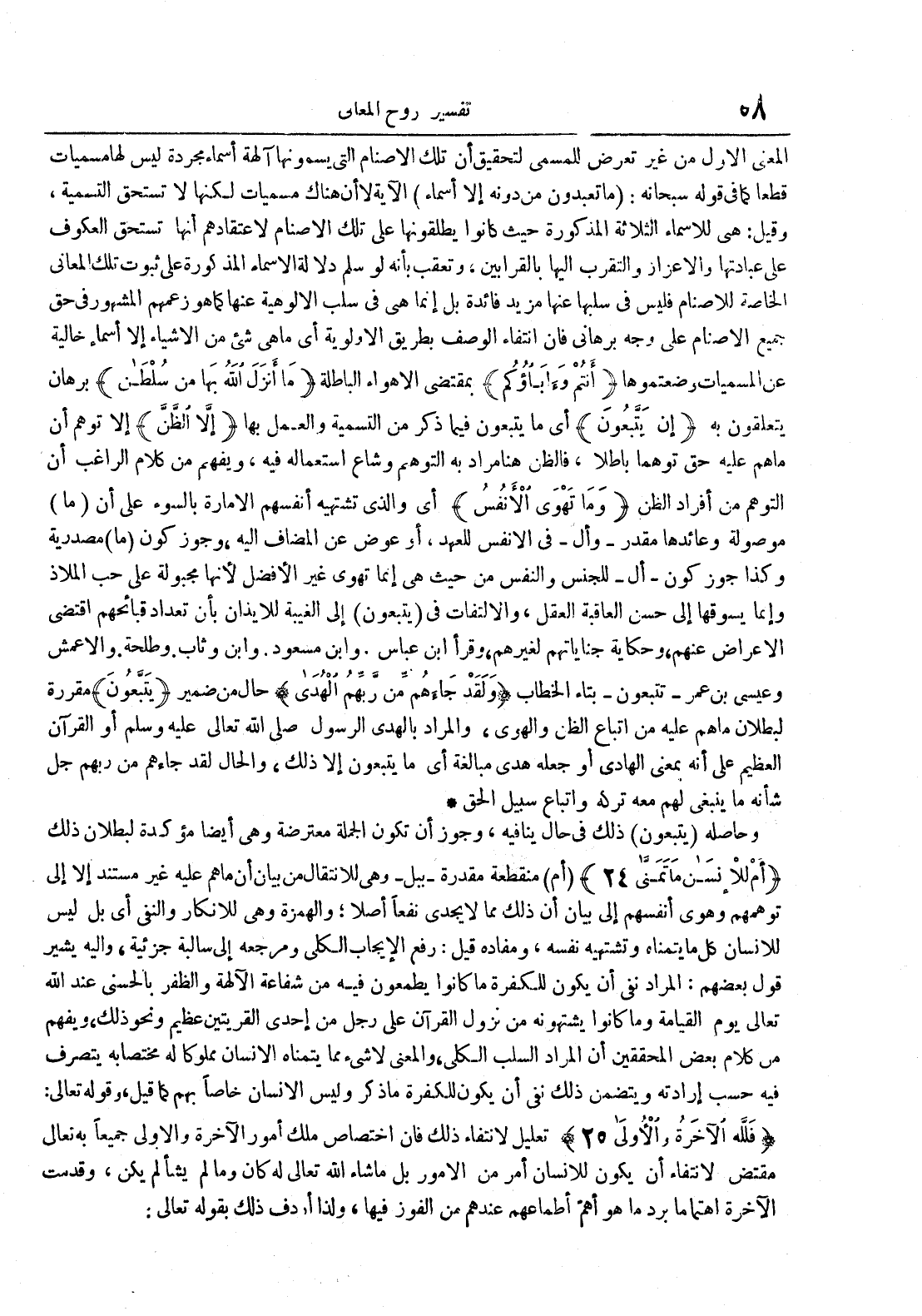 المعنى الأول من غير تعرض للمسمى لتحقيق أن تلك الأصنام التي يسمونها آلهة أسماء مجردة ليس لها مسميات قطعاكما في قوله سبحانه : ما تعبدون من دونهإلا أسماء الآية لا أن هناك مسميات لكنها لا تستحق التسمية وقيل : هي للأسماء الثلاثة المذكورة حيث كانوا يطلقونها على تلك الأصنام لاعتقادهم أنها تستحق العكوف على عبادتها والأعزاز والتقرب إليها بالقرابين وتعقب بأنه لو سلم دلالة الأسماء المذكورة على ثبوت تلك المعاني الخاصة للأصنام فليس في سلبها عنها مزيد فائدة بل إنما هي في سلب اللوهية عنها كما هو زعمهم المشهوفي حق جميع الأصنام على وجه برهاني فإن انتفاء الوصف بطريق الأولوية أي ما هي شيء من الأشاء إلا أسماء خالية عن المسميات وضعتموها أنتم وآباؤكم بمقتضى الأهواء الباطلة ما أنزل الله بها من سلطان برهان يتعلقون به إن يتبعو أي ما يتبعون فيما ذكر من التسمية والعمل بها إلا الظن إلا توهم أن ما هم عليه حق توهماباطلا فالظن هنا مراد به التوهم وشاع استعماله فيه ويفهم من كلام الراغب أن التوهم من أفراد الظن وما تهوى الأنفس أي والذي تشتهيه أنفسهم الأمارة بالسوء على أن ما موصولة وعائدها مقدر وأل في الأنفس للعهد أو عوض عن المضاف إليه وجوز كون ما مصدرية وكذا جوز كون أل للجنس والنفس من حيثهي إنما تهوى غير الأفضل لأنها مجبولة على حب الملاذ وإنما يسوقها إلى حسن العاقبة العقل والألتفات في يتبعون إلى الغيبة للأيذان بأن تعداد قبائحهم اقتضى الأغراض عنهم وحكاية جناياتهم لغيرهم وقرأابن عباس وابن مسعود وابن وثاب وطلحة والأعمش وعيسى بن عمر تتبعون بتاء الخطاب ولقد جاءهم من ربهم الهدى حال من ضمير يتبعو مقررة لبطلان ما هم عليه من اتباع الظن والهوى والمراد بالهدى الرسول صلى الله تعالى عليه وسلم أو القرآن العظيم علىأنه بمعنى الهادي أو جعله هدى مبالغة ما يتبعونإلا ذل : والحال لقد جاءهم من ربهم جلشأنهما ينبغي لهم معه تركه واتباع سبيل الحق