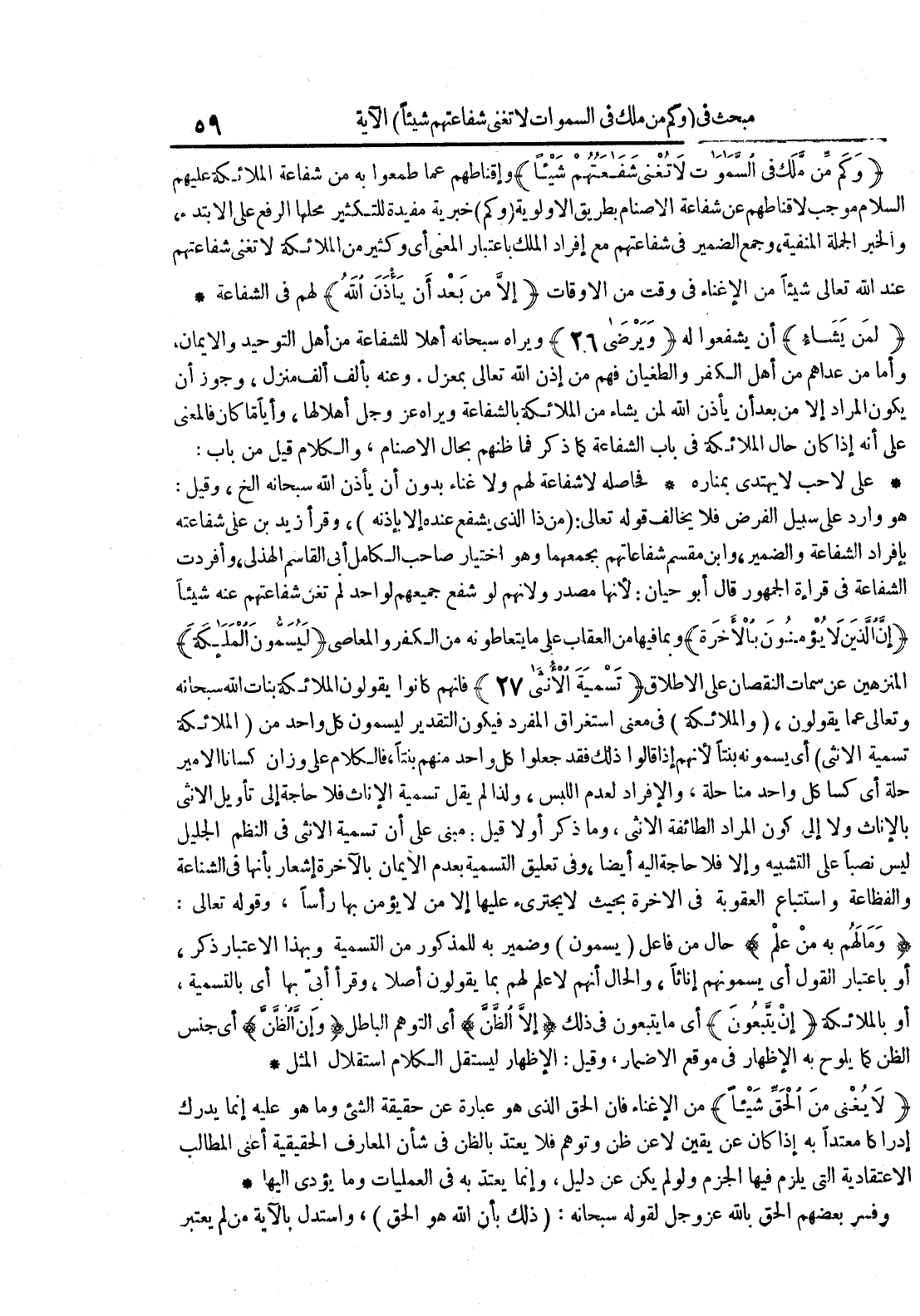 - ويراه سبحانه أهلا للشفاعة من أهل التوحيد والأيمان وأما من عداهم من أهل الكفر والطغيان فهم منإذن الله تعالى بمعزل وعنه بألف ألفمنزل وجوز أن يكون المراد إلا من بعد أن يأذن الله لمن يشاء من الملائكة بالشفاعة ويراه عز و جل أهلالها وأيا ما كان فالمعنى على أنه إذاكان حال الملائكة في باب الشفاعة كما ذكرنا فما ظنهم بحال الأصنام والكلام قيل من باب :