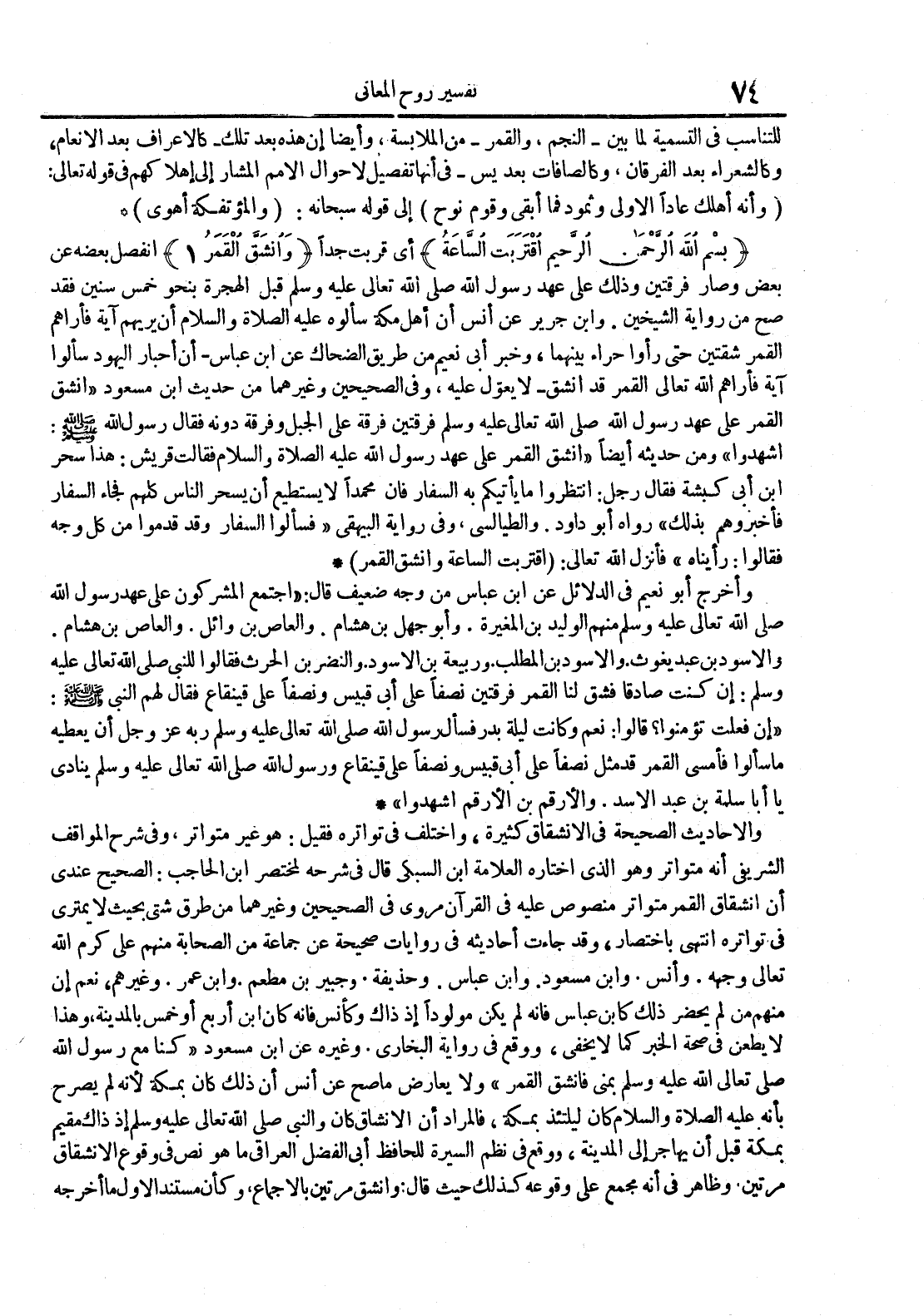 والأحاديث الصحيحة في الأنشقاق كثيرة واختلف في تواتره فقيل : هو غيرمتواتر وفي شرح المواقف الشريفي أنه متواتر الذي اختاره العلامة ابن السبكي قال في شرحه لمختصر ابن الحاجب : الصحيح عندي انشقاق القمر متواترمنصوص عليه في القرآن مروي في الصحيحين وغيرهما من طرق شتى بحيث لا يمتري في تواتره انتهى باختصار وقد جاءت أحاديثه في روايات صحيحةعن جماعةمن الصحابة منهم علي كرم الله تعالى وجهه وأنس وابن مسعود وابن عباس وحذيفة وجبير بن مطعم وابن عمر وغيرهم نعم إن منهم من لم يحضر ذلك كابن عباس فإنه لم يكنمولودا إذ ذاك وكأنسفإنه ابن أربع أو خمس بالمدينة وهذا لا يطعن في صحةالخبر كما لا يخفى ووقع في رواية البخاري وغيره عن ابن مسعود كنا مع رسول الله صلى الله تعالى عليه وسلم بمنى فانشق القمر ولا يعارض ما صح عن أنس أن ذلك بمكة لأنه لم يصرح بأنه عليه الصلاة و السلام كان ليتئذ بمكة فالمراد أن الإنشقاق كان والنبي صلى الله تعالى عليه وسلم إذ ذاك مقيم بمكة قبل أن يهاجر إلى المدينة ووقع في نظم السيرة للحافظ أبي الفضل العراقي ما هو نص في وقوع الأنشقاق