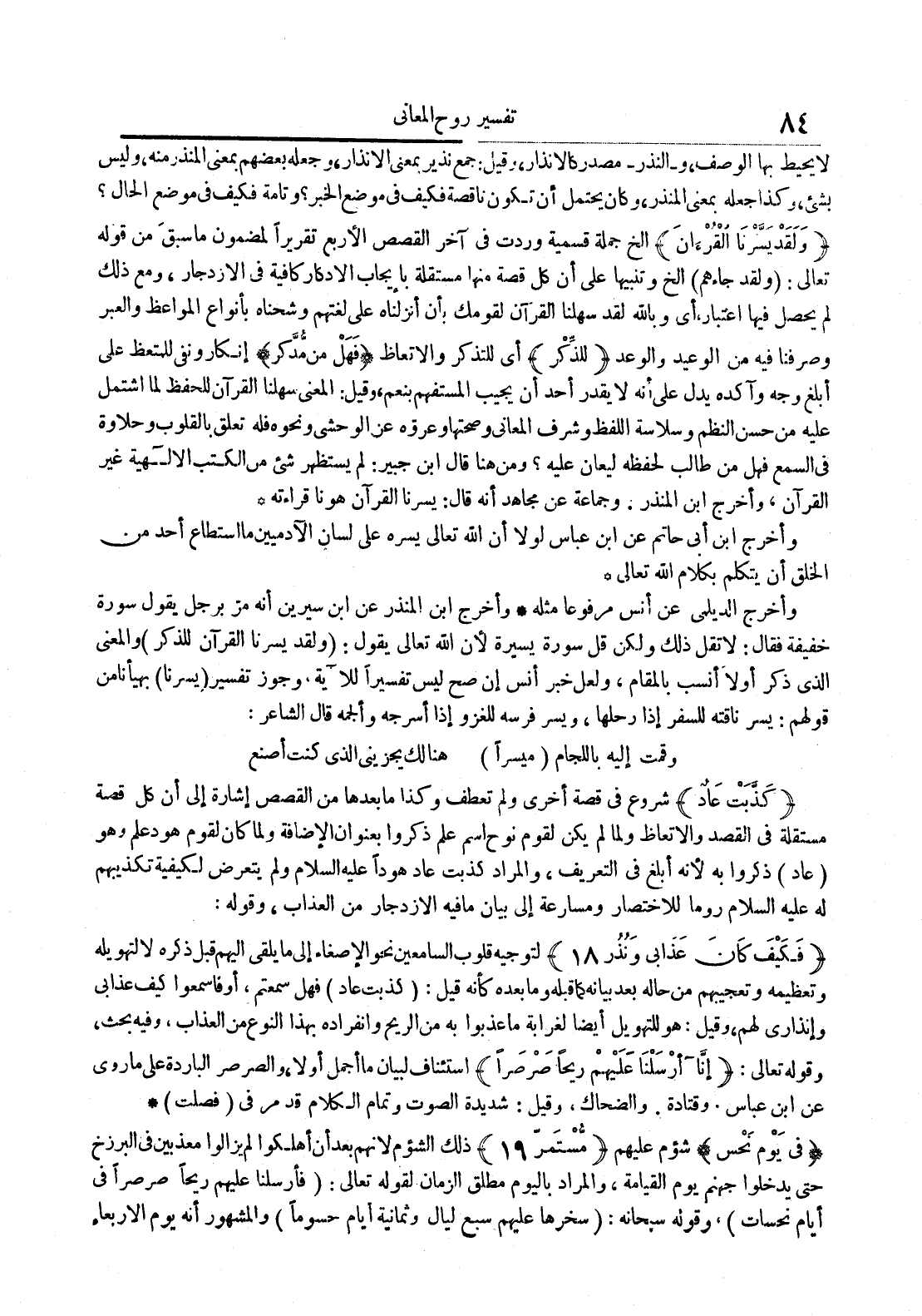 وأخرج ابن المنذرعن ابن سيرين أنه مر برجل يقول سورة خفيفة فقال : لا تقل ذلك ولكن قل سورة يسيرة لأن الله تعالى يقول : ولقد يسرنا القرآن للذكر والمعنى الذي ذكر أولاأنسب بالمقام ولعل خبر أنس إن صح ليس تفسيراللآية وجوز يسرنا بهيأنا منقولهم : يسر ناقته للسفر إذا رحلها ويسر فرسه للغزوإذا أسرجه وألجمه قال الشاعر : وقمت إليه باللجام ميسرا هنالك يجزيني الذي كنت أصنع كذبت عاد شروع في قصة أخرى ولم تعطف وكذا ما بعدها من القصص إشارة إلى أن كل قصة مستقلة في القصد والأتعاظ ولما لم يكن لقوم نوح اسم ذكروا بعنوا الإضافة ولما كان لقوم هود علم وهو عاد ذكروا به لأنه أبلغ في التعريف والمراد كذبت عاد هودا عليه السلام ولميتعرض لكيفية تكذيبهم له عليه السلام روما للأختصار ومسارعة إلى بيان ما فيه الأزدجار من العذاب وقوله : فكيفكان عذابي ونذر