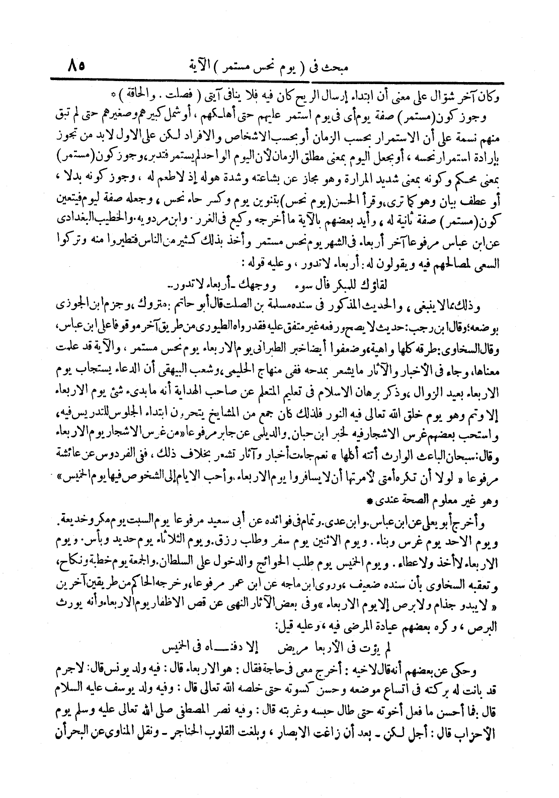 وجوز كون مستمر صفة يوم أي في يوم استمرعليهمحتىأهلكهم أو شمل كبيرهمصغيرهم حتى لم تبق منهم نسمة علىأن الأستمرار بحسب الزمان أو بحسبالأشخاص لكن على الأوللا بدمن تجوز بإرادة استمرار نحسه أو بجعلاليوم بمعنى مطلق الزمان لأن اليوم الواحد لم يستمر فتدبر وجوزكون مستمر بمعنى محكم وكونه بمعنى شديد المرارة وهو مجاز عن بشاعته وشدة هوله إذ لا طعم له وجوز كونه بدلا أو عطف بيان وهو كما ترى وقرأالحسن يوم نحس بتنوينيوم وكسر حاء نحس وجعله صفة ليوم فيتعين كون مستمر صفة ثانية له وأيد بعضهم بالآية ما أخرجه وكيع في الغرر وابن مردويه والخطيب البغدادي عن ابن عباس مرفوعا آخر أربعاء في الشهر يومنحس مستمر وأخذبذلك كثير من الناس فتطيروا منهوتركوا السعي لمصالحهم فيه ويقولون له : أربعاء لا تدور وعليه قوله : لقاؤك للمبكر فأل سوء ووجهك أربعاء لا تدور وذلك مما لا ينبغي والحديث المذكور في سنده ميلمة بن الصلت قال أبو حاتم : متروك وجزم ابن الجوزي بوضعه قال ابن رجب : حديث لا يصح رفعه غير متفق عليه فقد رواه الطيوري من طريق آخر موقوفاعلى ابن عباس وقال السخاوي : طرقه كلها واهية وضعفوا خبر الطبراني يوم الأربعاء يوم نحس مستمر والآية قد علمت معناها وجاء في الأخبار والآثار ما يشعر بمدحه ففي منهاج الحليمي وشعب البيهقي أن الدعاء يستجاب يومالأربعاء بعيد الزوال وذكر برهان الإسلام في تعليم المتعلم عن صاحب الهداية أنه ما بديء شيء يوم الأربعاء إلاوتم وهو خلق الله تعالى فيه النور فلذلك كان جمع من المشايخ يتحرون ابتداء الجلوس للتدريس فيه واستحب بعضهم غرس الأشجار فيه لخبر ابن حبان والديلمي عن جابر مرفوعامن غرس الأشجار يوم الأربعاء وقال : سبحان الباعث الوارث أتته أكلها نعم جاءت أخبار وآثار تشعر بخلاف ذلك ففي الفردوس عن عائشة مرفوعا لو لا أن تكره لأمرتها أن لا يسافروا يوم الأربعاء وأحب الأيام إلي الشخوص فيها يوم الخميس وهو غير معلوم الصحة عندي