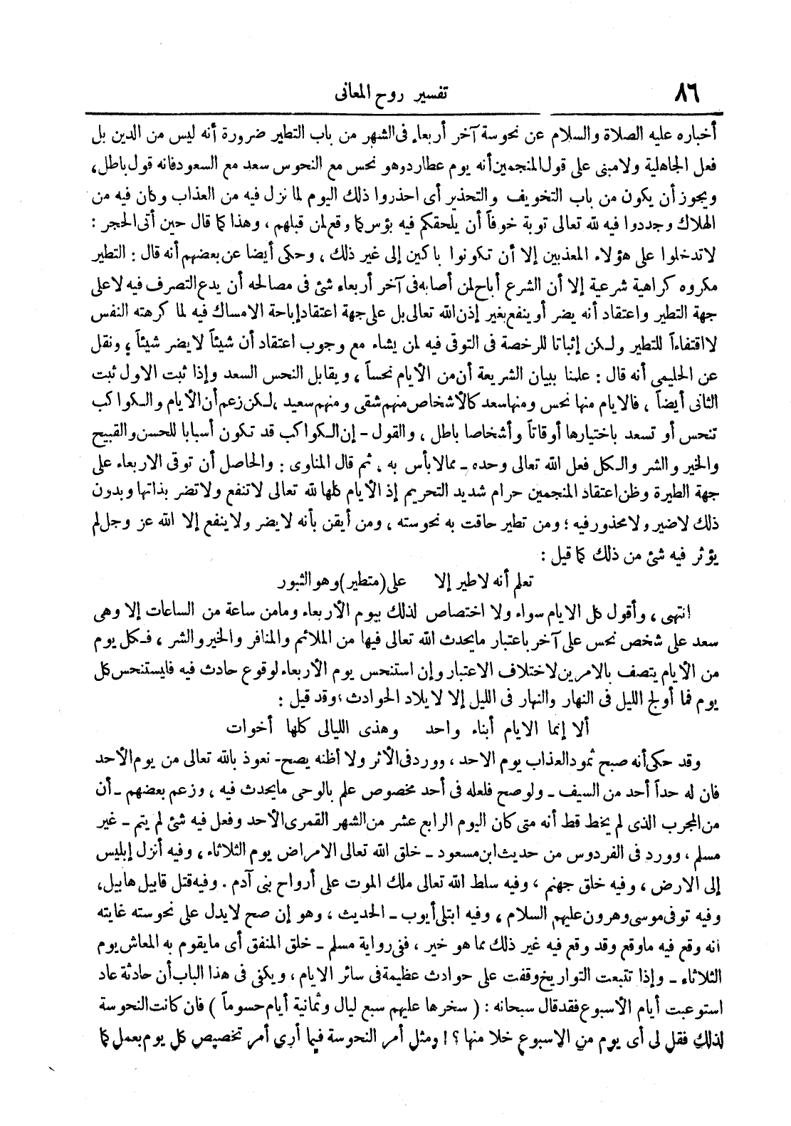 أخباره عليه الصلاة و السلام عن نحوسة آخر أربعاء في الشهر من باب التطير ضرورة أنه ليسمن الدين بل فعل الجاهلية ولا مبني على قول المنجمين أنهيوم عطارد وهو نحس من النحوس سعدمع السعود فإنه قول باطل ويجوز أن يكون من باب التخويف والتحذير أياحذروا ذلك اليوم لما نزل فيه من العذاب وكان فيهمن الهلاك وجددوا فيه لله تعالى توبة خوفاأن يلحقكم فيه بؤسكما وقع لمن قبلهم وهذا كما قال حين أتى الحجر : لا تدخلوا على هؤىء المعذبين إلا أن تكونوا باكين إلى غير ذلك وحكى أيضاعن بعضهم أنه قال : التطير مكروه كراهية شرعية إلا أن الشرع أباح لمن أصابه في آخر أربعاء شيء فيمصالحه أن يدع التصرف فيه لا على جهة التطير واعتقاد أنه يضر أو ينفع بغير إذن الله تعالى بل على جهة إباحة الإمساك فيه لمن كرهته النفس لا اقتفاءا للتطيرولكن إثباتاللرخصة في التوفي فيه لمن يشاء معوجوب اعتقاد أن شيئا لا يضر شيئا ونقل عن الحليمي أنه قال : علمنا ببيان الشريعة أن من الأيام نحسا ويقابل النحس السعد وإذاثبت الأول ثبت الثاني أيضا فالأيام منها نحس ومنها سعدكالأشخاص منهم شقي ومنهم سعيد لكن زعم أن اليام والكواكب تنحس أو تسعدباختيارها أوقاتاوأشخاصا باطل والقول إن الكواكب قد تكون أسباباللحسن والقبيح والخير والشر والكل فعل الله تعالى وحده مما لا بأس به ثمقال المناوي : والحاصل أن توفي الأربعاء على جهة الطيرة وظن اعتقاد المنجمين حرام شديد التحريم إذ الأيام كلها لله تعالى لا تنفع ولا تضر بذاتها وبدون ذلك لا ضير ولا محذور فيه ومن تطير حاقت به نحوسته ومن أيقن أنه لا يضر ولا ينفع إلا الله عز و جل لم يؤثر فيه شيء من ذلك كما قيل : تعلم أنه لا طير إلا على متطير وهو الثبور انتهى وأقول كل الأيام سواء ولا اختصاص لذلك بيوم الأربعاء ومامن ساعة من الساعات إلا وهي سعد على شخص نحس على آخر باعتبار ما يحدث الله تعالى فيها من الملائم والمنافر والخير والشر فكل يوم من الأيام يتصف بالأمرين لاختلاف الأعتبار وإن استنحس يوم الأربعاء لوقوع حادث فيه فليستنحس كل يوم فما أولج الليل في النهار والنهار في الليل إلآ يلاد الحوادث وقد قيل : ألا إنما الأيام أبناء واحد وهذي الليالي كلها أخوات وقد حكى أنه ثمود العذاب يوم الأحد وورؤدفي الأثر أظنه يصح نعوذ بالله تعالى من يوم الأحذ فإن له حدا أحد من السيف ولو صح فلعله في أحد مخصوص علم بالوحي ما يحدث فيه وزعم بعضهم أن من المجرب الذيلم يخط أنه متى كان اليوم الرابع عشر من الشهر القمري الأحد وفعل فيه شيء لم يتم غير مسلم وورد في الفردوس من حديث ابن مسعود خلق الله تعالى الأمراض يوم الثلاثاء وفيه أنزل إبليس إلى الأرض وفيه خلق جهنم وفيه سلط الله تعالىملك الموت على أرواح بني آدم وفيه قتل قابيل هابيل وفيه توفي موسى وهارون عليهم السلام وفيه ابتلي أيوب الحديث وهو إن صح لا يدل على نحوسته غايته وقع فيه ما وقع وقد وقع فيه غير ذلك مما هو خير ففي رواية مسلم خلق المنفق أي ما يقوم به المعاش يوم الثلاثاء وإذا تتبعت التواريخ وقفت على حوادث عظيمة في سائر الأيام ويكفي هذا الباب أن حادثة عاد استوعبت أيام الأسبوع فقدقال سبحانه : سخرها عليهم سبع ليال وثمانية أيامحسوما فإن كانت النحوسة لذلك فقل لي أي يوم من الأسبوع خلا منها ! ومثل أمر النحوسة فيما أرى أمر تخصيصكل يوم بعمل كما