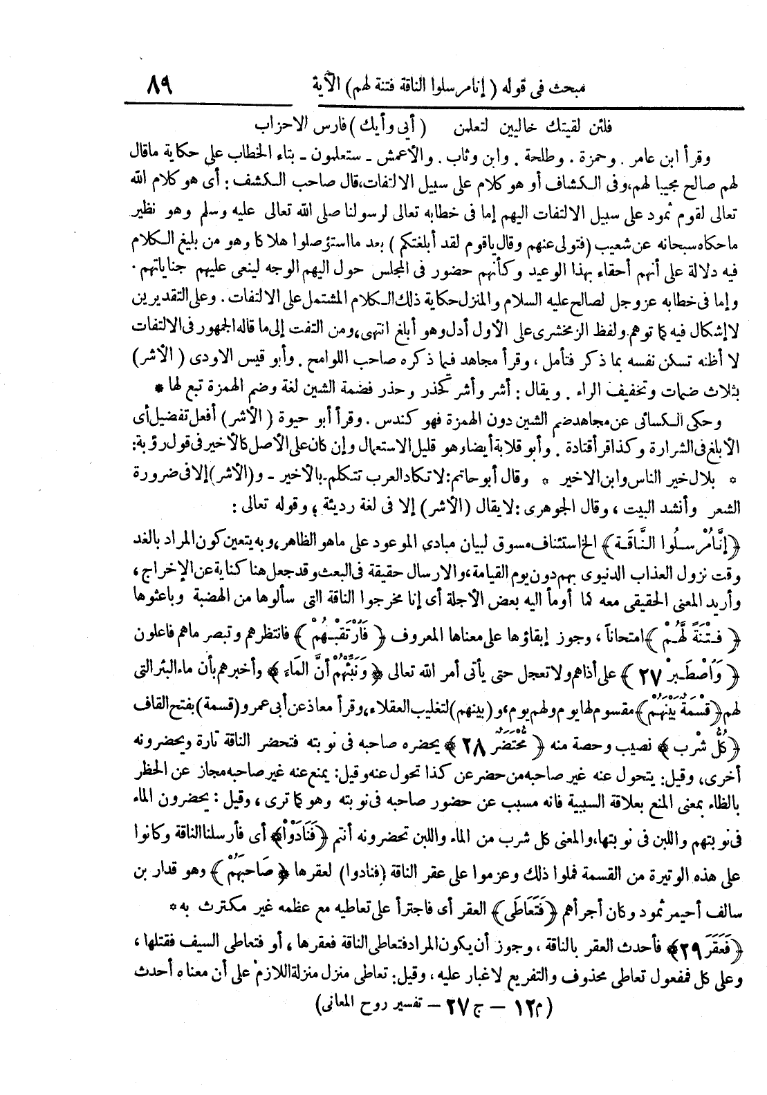 - يحضره صاحبه في نوبته فتحتضر الناقة تارة ويحضرونه أخرى وقيل : يتحول عنه غير صاحبه من حضر عن كذا تحول عنه وقيل : يمنع عنه غير صاحبه مجاز عن الحظر بالظاء بمعنى المنع بعلاقة السببية فإنمسبب عن حضور صاحبه في نوبته وهو كما ترى وقيل : يحضرون الماء في نوبتهم واللبن فينوبتها والمعنى كل شرب من الماء واللبن يحضرونه أنتم فنادوا أي فأرسلنا الناقة وكانوا على هذه الوتيرة من القسمة فملوا ذلك وعزموا على عقر الناقة فنادوا لعقرها صاحبهم وهو قدار بن سالفأحمير ثمود وكان أجرأهم فتعاطى العقر أي فاجترأ على تعاطيه مععظمته غير مكترث به
