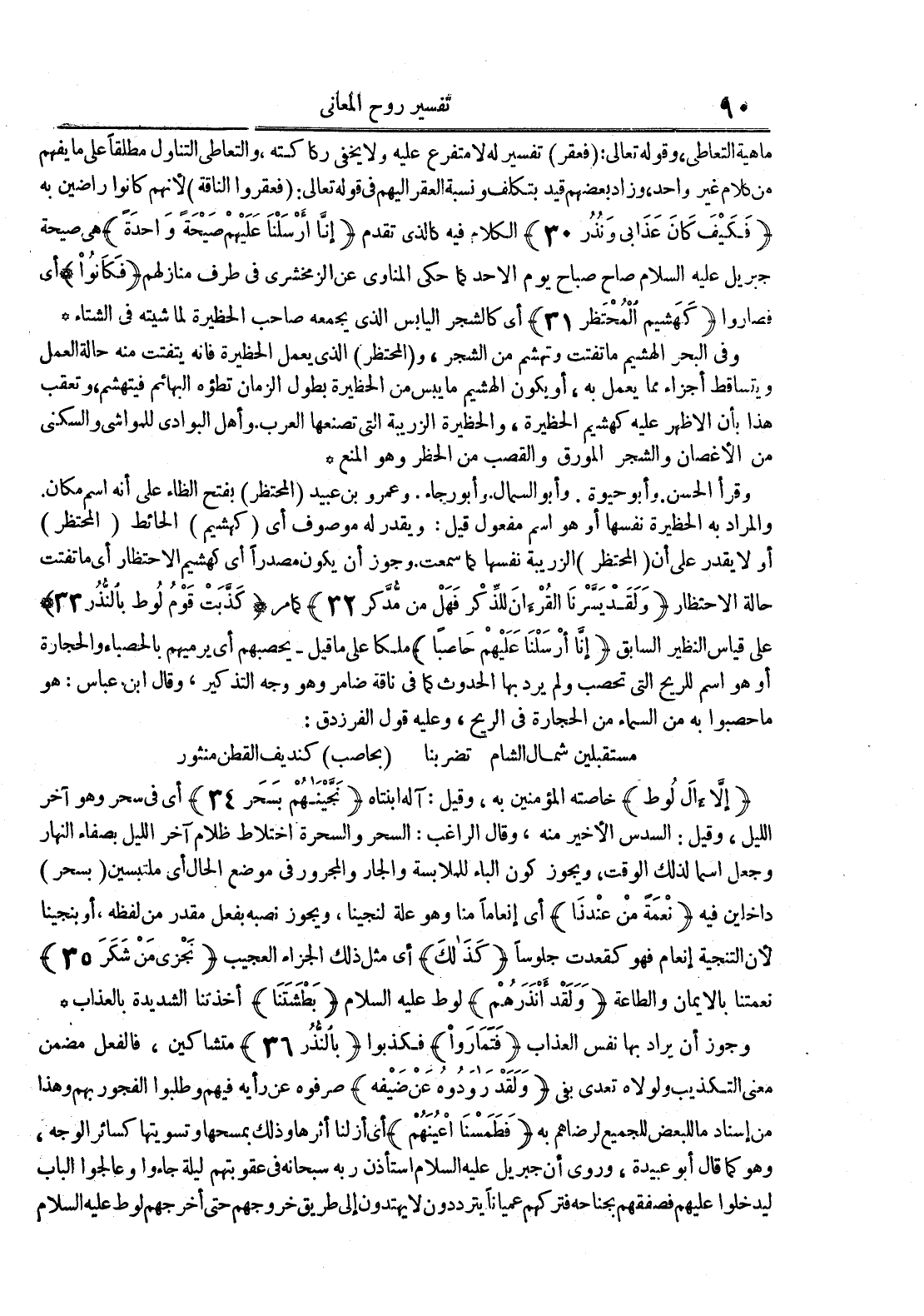 - علىقياس النظر السابق إنا أرسلنا عليهم حاصبا ملكاعلى ما قيل يحصبهم أي يرميهم بالحصباء والحجارة أو هو اسم للريح التي تحصب ولم يرد الحدوث كما في ناقة ضامر وهو وجه التذكير وقالابن عباس : هو ما حصبوا به من السماء من الحجارة في الريح وعليه قول الفرزدق : مستقبلين شمال الشام تضربنا بحاصب كنديف القطن منثور إلا إل لوط خاصته المؤمنين به وقيل : آله ابنتاه نجيناهم بسحر