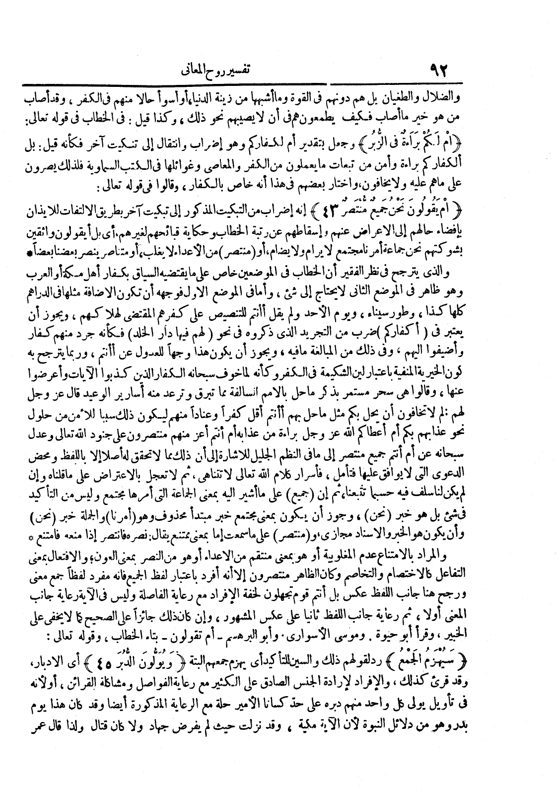 والذي يترجح في نظر الفقير أن الخطاب في الموضعين خاص على ما يقتضيه السياق بكفار أهل مكةأو العرب وهو ظاهر في الموضع الثاني لا يحتاج إلى شيء وأما في الموضع الأول فوجهه أن تكون الإضافة مثلها في الدراهم كلها كذا وطور سينائ ويوم الأحدولم يقل أأنتم للتنصيص على كفرهم المقتضي لهلاكهم ويجوز أن يعتبر في أكفاركم ضرب من التجريد الذي ذكروه في نحو لهم فيها دار الخلد فكأنه جرد منهم كفار وأضيفوا إليهم وفي ذلك من المبالغة ما فيه ويجوز أن يكون هذا وجها للعدول على أأنتم وربما يترجح به كون الخيرية المنفية باعتبار لين الشكيمة في الكفر وكأنه لما خوف سبحانه الكفار الذين كذبوا الآيات وأعرضوا عنها وقالوا هي سحر مستمر بذكر ما حل بالأمم السالفة مما تبرق وترعد منه أسارير الوعيد قال عز و جل لهم : لم لا تخافون أن يحل بكم مثل ما حل بهم أأنتم أقل كفرا وعنادا منهمليكون ذلك سبباللأمن من حلول نحو عذابهم بكم أم أعطاكم الله عز و جل براءة من عذابه أنتم أعز نمنهم منتصرون على جنود الله تعالى وعدل سبحانه عن أم أنتم جميع منتصر إلى ما في النظم الجليل للإشارة إلى أن مما لا تحقق له أصلا إلا باللفظ ومحض الدعوى التي لا يوافق عليها فتأمل فأسروا كلام الله تعالى لا تتناهى ثم لا تعجل بالأعتراض على ما قلناه وإن لم يكن لنا سلف فيه حسبما تتبعنا ثم إن جميع على ما أشير إليه بمعنى التي أمرها مجتمع وليسمن التأكيد في شيء بل هو خبر نحن وجوز أن يكو بمعنى مجتمع خبر مبتدأ محذوف وهو أمرنا والجملة خبر نحن وأن يكون هو الخبر والإسناد مجازي و منتصر على ما سمعت إما بمعنى ممتنع يقال : نصره فانتصر إذا منعه فامتنع