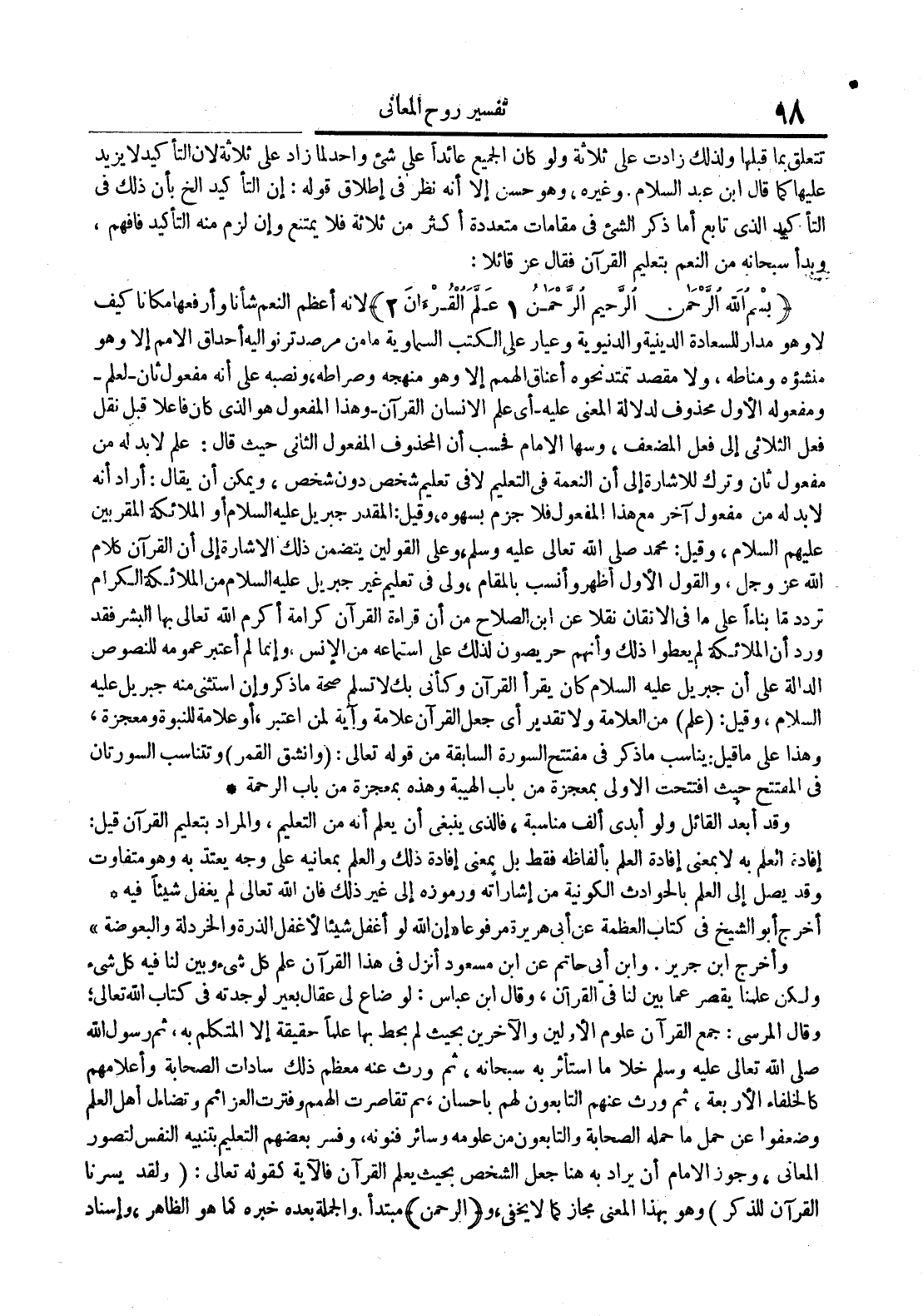 أخرج أبو الشيخ في كتاب العظمة عن أبي هريرة مرفوعاإن الله لو أغفل شيئالأغفل الذرة والخردلة والبعوضة وأخرج ابن جرير وابن أبي حاتم عن ابن مسعود أنزل في هذا القرآن علم كل شيء وبين لنا فيه كل شيء ولكن علمنا يقصر عما بين لنا في القرآن وقال ابن عباس : لو ضاع لي عقال بعير لوجدته في كتاب الله تعالى وقال المرسي : جمع القرآن علوم الأولين والآخرين بحيث لم يحط بها علما حقيقة إلا المتكلم به ثمر صلى الله تعالى عليه وسلم خلا ما استأثر به سبحانه ثم ورث عنه معظم ذلك سادات الصحابة وأعلامهم كالخلفاء الأربعة ثم ورث عنهم التابعونلهم بإحسان ثم تقاصرت الهمم وفترت العزائم وتضاءل أهل العلم وضعفوا عن حمل الصحابة ما حمل الصحابة والتابعومن علومه وسائر فنونه وفسر بعضهم التعليم بتبنيه النفس لتصور المعاني وجوز الإمام أن يراد به هنا جعل الشخص بحيث يعلم القرآن كقوله تعالى : ولقديسرنا القرآن للذكر وهو بهذا المعنى مجاز كما لا يخفى و الرحمن مبتدأ والجملة بعده خبره كما هو الظاهر وإسناد