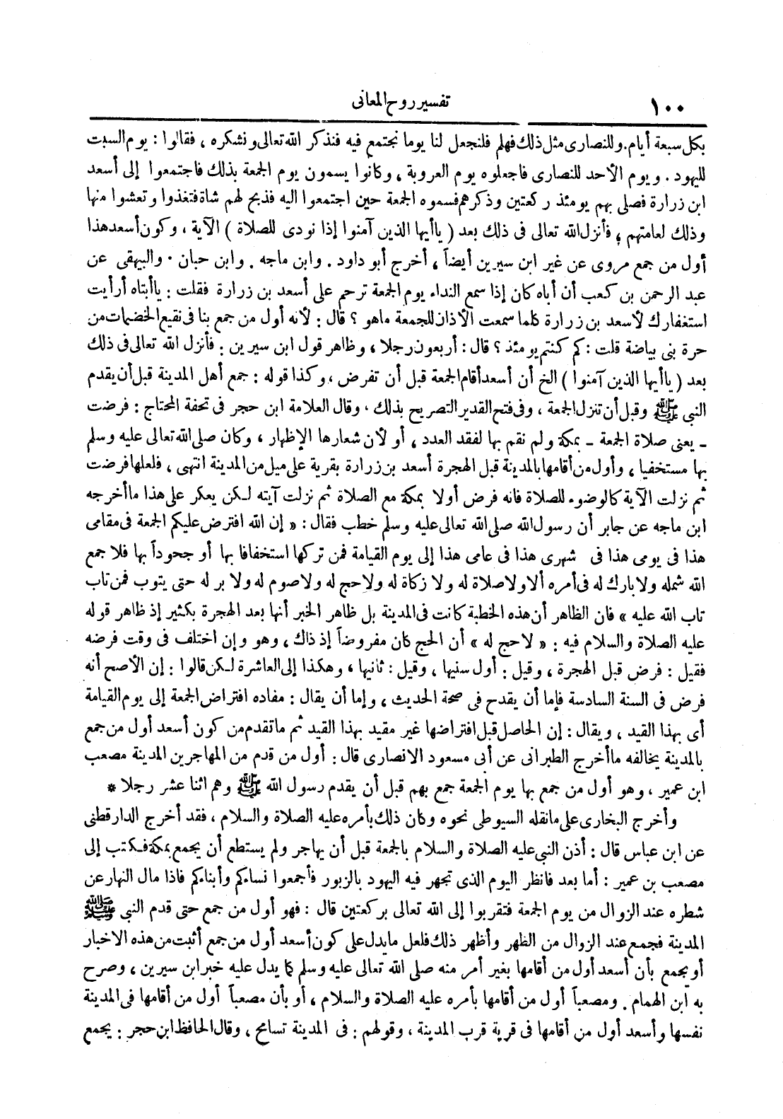 بكل سبعة أيام وللنصارى مثل ذلك فهلم فلنجعل لنا يوما تجتمع فيه فنذكر الله تعالى ونشكره فقالوا : يوم السبت لليهود ويوم الأحد للنصارى فاجعلوه يوم العروبة وكانوا يسمون يوم الجمعة بذلك فاجتمعوا إلى أسعد ابن زرارة فصلى بهم يومئذ ركعتين وذكرهم فسموه الجمعة حين اجتمعوا إليه فذبح لهم شاة فتغذوا وتعشوا منها وذلك لعامتهم فأنزل الله تعالىفي ذلك بعد يا أيها الذين آمنوا إذا نودي للصلاة الآية وكون أسعد هذا أول من جمع مروي عن غير ابن سيرين أيضا وأخرج أبو داود وابن ماجه وابن حبان والبيهقي عن عبد الرحمن بن كعب أن أباه كان غذا سمع النداء يوم الجمعة ترحم على أسعد بن زرارة فقلت : يا أبتاه أرأيت استغفارك لأسعد بن زرارة كلما سمعت الأذان للجمعة ما هو قال : لأنه أول من جمع بنا في نقيع الخضمات من حرة بني بياضة قلت : كم كنتم يومئذ قال : أربعون رجلا وظاهر قول ابن سيرين : فأنزل الله تعالى في ذلك بعد يا أيها الذين آمنوا الخ أن أسعد أقام الجمعة قبل أن تفرض وكذا قوله : جمع أهل المدينة قبل أن يقدم النبي صلى الله عليه و سلم وقبل أن تنزل الجمعة وفي الفتح القدير التصريح بذلك وقال العلامة ابن حجر في تحفة المحتاج : فرضت يعني صلاة الجمعة بمكة ولم نقم بها لفقد العدد أو لأن شعارها الإظهار وكان صلى الله تعالى عليه وسلم بها مستخفيا وأول من أقامها بالمدينة قبل الهجرة أسعد بن زرارة بقرية على ميل من المدينة انتهى فلعلها فرضت ثم نزلت الآية كالوضوء للصلاة فإنه فرض أولا بمكة مع الصلاة ثم نزلت آيته لكن يعكر على هذا ما أخرجه ابن ماجه عن جابر أن رسول الله صلى الله تعالى عليه وسلم خطب فقال : إن الله افترض عليكم الجمعة في مقاميهذا في يومي هذا في شهري هذا في عامي هذا إلى يوم القيامة فمن تركها استخفافا بها أو جحودا بها فلا جمع الله شمله ولا بارك له في أمره ألا ولا صلاة له ولا زكاة ولا حج ولا صوم ولا بر له حتى يتوب فمن تاب تاب الله عليه فأن الظاهر أن هذه الخطبة كانت في المدينة بل ظاهر الخبر أنها بعد الهجرة بكثير إذ ظاهر قوله عليه الصلاة و السلام فيه : لا حج له أن الحج كان مفروضا إذ ذاك وهو وإن اختلف في وقت فرضه فقيل : فرض قبل الهجرة وقيل : أول سنيها وقيل : ثانيها وهكذا إلى العاشرة لكن قالوا : إن الأصح أنه فرض في السنة السادسة قلإن أن يقدح في صحة الحديث وإما أن يقال : مفاده افتراض الجمعة إلى يوم القيامة أي بهذا القيد ويقال : إن الحاصل قبل افتراضها غير مقيد بهذا القيد ثم ما تقدم من كون أسعد أول من جمع بالمدينة يخالفه ما أخرج الطبراني عن أبي مسعود الأنصاري قال : أول من قدم من المهاجرين المدينة مصعبابن عمير وهو أول من جمع بها يوم الجمعة جمع بهم قبل أن يقدم رسول الله صلى الله عليه و سلم وهم اثنا عشر رجلا
