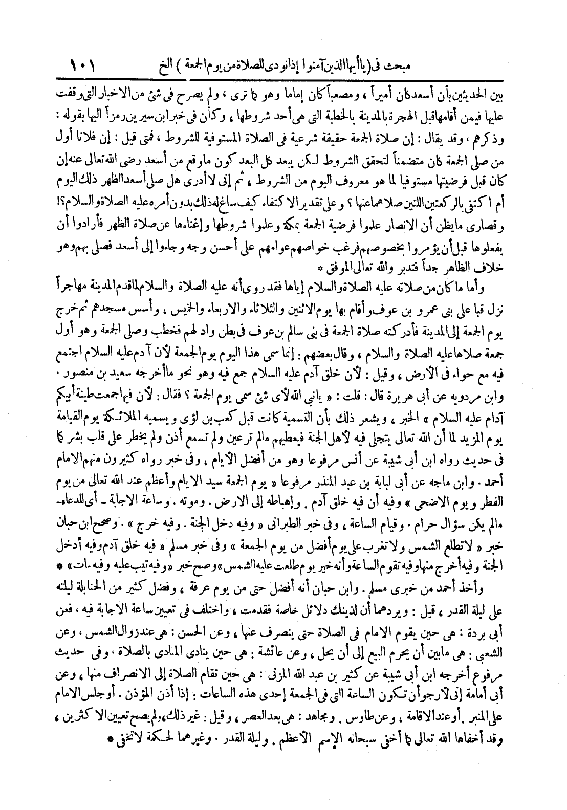وأخذ أحمد من خبري مسلم وابن حبان أنه أفضل حتى من يوم عرفة وفضل كثير من الحنابلة ليلته على ليلة القدر قيل : ويردهما أن لذينك دلائل خاصة فقدمت واختلف في تعيين ساعة الإجابة فيه فعنأبي بردة : هي حين يقوم الإمام في الصلاة حتى ينصرف عنها وعن الحسن : هي عند زوال الشمس وعنالشعبي : هي ما بين أن يحرم البيع إلى أن يحل وعن عائشة : هي حين ينادي المنادي بالصلاة وفي حديثمرفوع أخرجه ابن أبي شيبة عن كثير بن عبد الله المزني هي حين تقام الصلاة إلى الأنصراف منها وعن أبي أمامة إني لأرجو أن تكون الساعة التي في الجمعة إحدى هذه الساعات : إذا أذن المؤذن أو جلس الإمام على المنبر أو عند الإقامة وعن طاوس ومجاهد : هي بعد العصر وقيل : غير ذلك ولم يصح تعيين الأكثرين وقد أخفاها الله تعالى كما أخفى سبحانه الإسم الأعظم وليلة القدر وغيرهما لحكمة لا تخفى