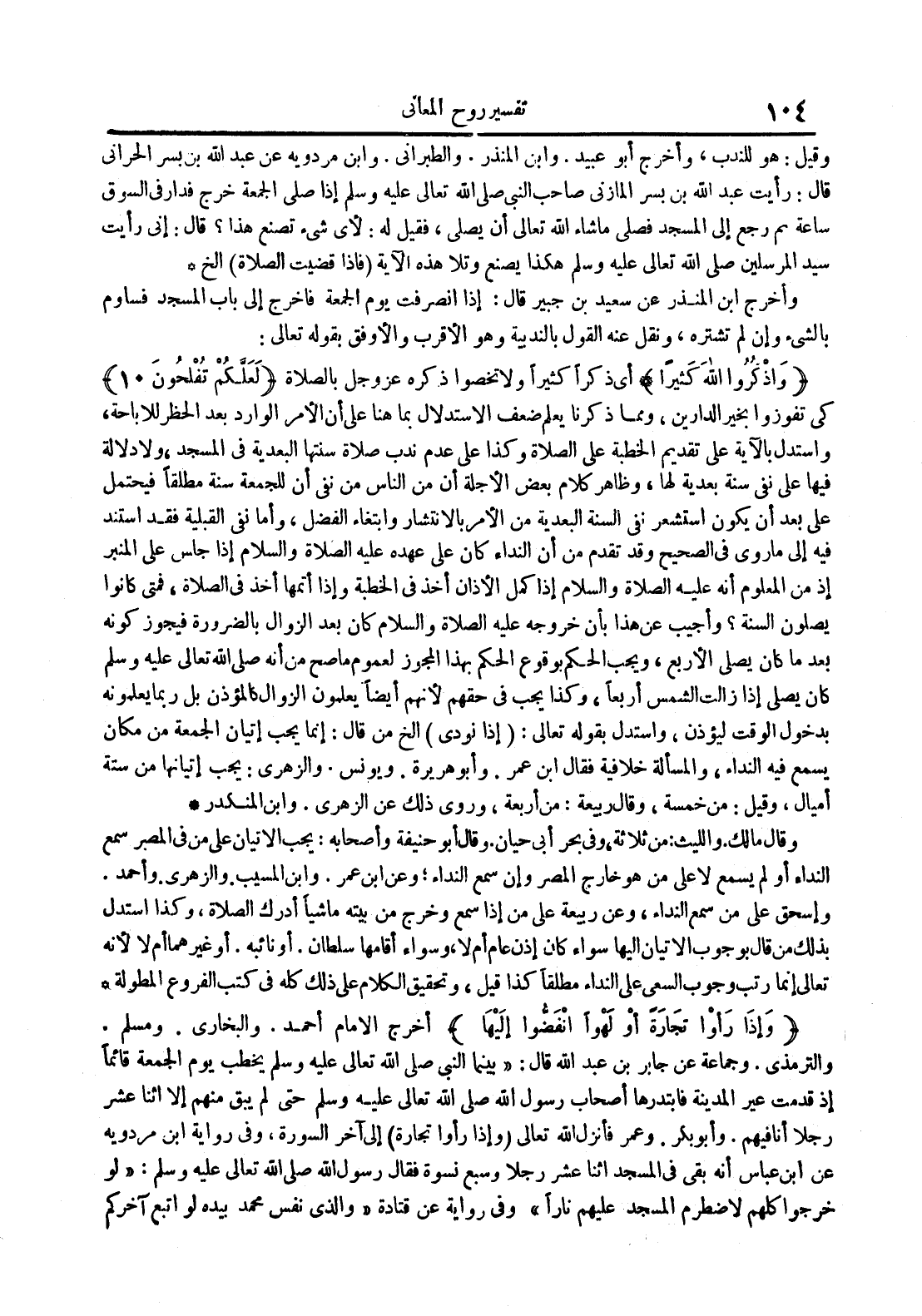 - كي تفوزوا بخير الدارين ومما ذكرنا يعلم ضعف الأستدلال بما هنا على أن الأمر الوارد بعد الحظرللأباحة واستدل بالآية على تقديم الخطبة على الصلاة وكذا على عدم ندب صلاة سنتها البعدية في المسجد ولا دلالة فيها على نفي سنة بعدية لها وظاهر كلام بعض الأجلة أن من الناس من نفى أن للجمعة سنة مطلقا فيحتمل على بعد أن يكون استشعر نفي السنة البعدية من ألأمر بالأنتشار وابتغاء الفضل وأمانفي القبلية فقد استند فيه إلى ما روي في الصحيح وقد تقدم من أن النداء كان على عهده عليه الصلاة الصلاة والسلام إذا جلس على المنبر إذ من المعلوم أنه عليه الصلاة و السلام غذ كمل الأذان أخذ في الخطبة وإذا أتمها أخذ في الصلاة فمت كانوا يصلون السنة وأجيب عن هذا بأن خروجه عليه الصلاة و السلام كان بعد الزوال بالضرورة فيجوز كونه بعد ما كان يصلي الأربع ويجب الحكم بوقوع الحكم بهذا المجوز لعموم ما صح من أنه صلى الله تعالى عليه وسلم كان يصلي إذا زالت الشمس أربعا وكذا يجب في حقهم لأنهم أيضا يعلمون الزوال كالمؤذن بل ربما يعلمونه بدخول الوقت ليؤذن واستدل بقةله تعالى : إذا نودي الخ من قال : إنما بجي إتيان الجمعة من مكان يسمع فيه النداء والمسألة خلافية فقال ابن عمر وأبو هريرة ويونس والزهري : يجب إتيانها من ستةأميال وقيل : من خمسة وقال ربيعة : من أربعة وروي ذلك عن الزهري وابن المنكدر