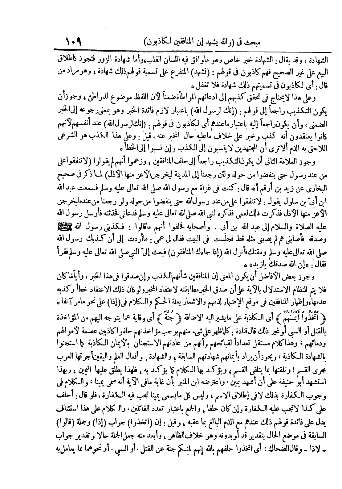 الشهادة وقد يقال : الشهادة خبر خاص وهو ما وافق فيه اللسان القلب وأما شهادة الزور فتجوز كإطلاق البيع على غير الصحيح فهم كاذبون في قولهم : نشهد المتفرع على تسمية قولهم ذلك شهادة وهو مراد من قال : أي لكاذبون في تسميتهم ذلك شهادة فلا تغفل