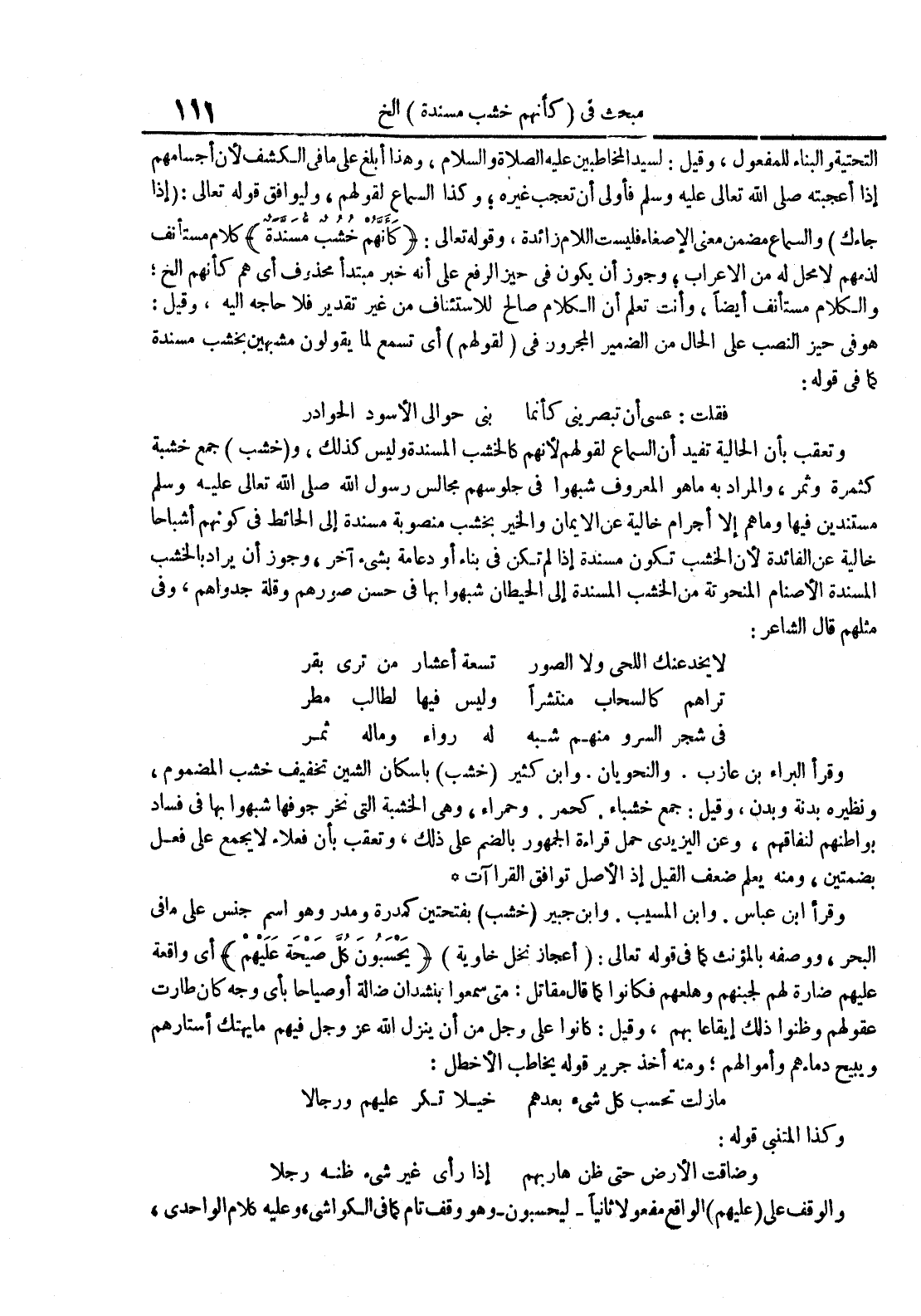 التحتية والبناء للمفعول وقيل : لسيد المخاطبين عليه الصلاة و السلام وهذا أبلغ على ما في الكشف لأن أجسامهمإذا أعجبته صلى الله تعالى عليه وسلم فأولى أن تعجب غيره وكذا السماع لقولهم وليوافق قوله تعالى : إذا جاءك والسماع مضمن معنى الإصغاء فليست اللام زائدة وقوله تعالى : كأنهم خشب مسندة كلام مستأنف لذمهم لا محل له من الإعراب وجوز أن يكون في حيز الرفع على أنه خبر مبتدأ محذوف أي هم كأنهم الخ والكلام مستأنف أيضأ وأنت تعلم أن الكلام صالح للأستئناف من غير تقدير فلا حاجة إليه وقيل : هو في حيز النصب على الحال من الضمير المجرور في لقولهم أي تسمع لما يقولون مشبهين بخشب مسندةكما في قوله : فقلت : عسى أن تبصرني كأنما بني حوالي الأسود الحوار وتعقب بأن الحالية تفيد أن السماع لقولهم لأنهم كالخشب المسندة وليس كذلك و خشب جمع خشبة كثمرة وثمر والمراد به ما هو المعروف شبهوا في جلوسهم مجالس رسول الله صلى الله تعالى عليه وسلم مستندين فيها وما هم إلا أجرام خالية عن الإيمان والخير بخشب منصوبة مسندة إلى الحائط في كونهم أشباحا خالية عن الفائدة لأن الخشب تكون مسندةإذا لم تكن في بناء أو دعامة بشيء آخر وجوز أن يراد بالخشب المسندة الأصنام المنحوتة من الخشب المسندة إلى الحيطان شبهوا بها في حسن صورهم وقلة جدواهم وفي مثلهم قال الشاعر : لا يخدعنك اللحي ولا الصور تسعة أعشار من ترى بقر تراهم كالسحاب منتشرا وليس فيها لطالب مطر وفي شجر السرو منهم شبه له وراء وماله ثمر وقرأ البراء بن عازب والنحويان وابن كثير خشب بإسكان الشين تخفيف خشب المضموم ونظيره بدن وقيل : جمع خشباء كحمر وحمراء وهي الخشبة التي جوفها شبهوا بها في فساد بواطنهم لنفاقهم وعن اليزيدي حمل قراءة الجمهور بالضم على ذلك وتعقب بأن فعلاء لا يجمع على فعل بضمتين ومنه يعلم ضعف القيل إذا إذ الأصل توافق القراآت