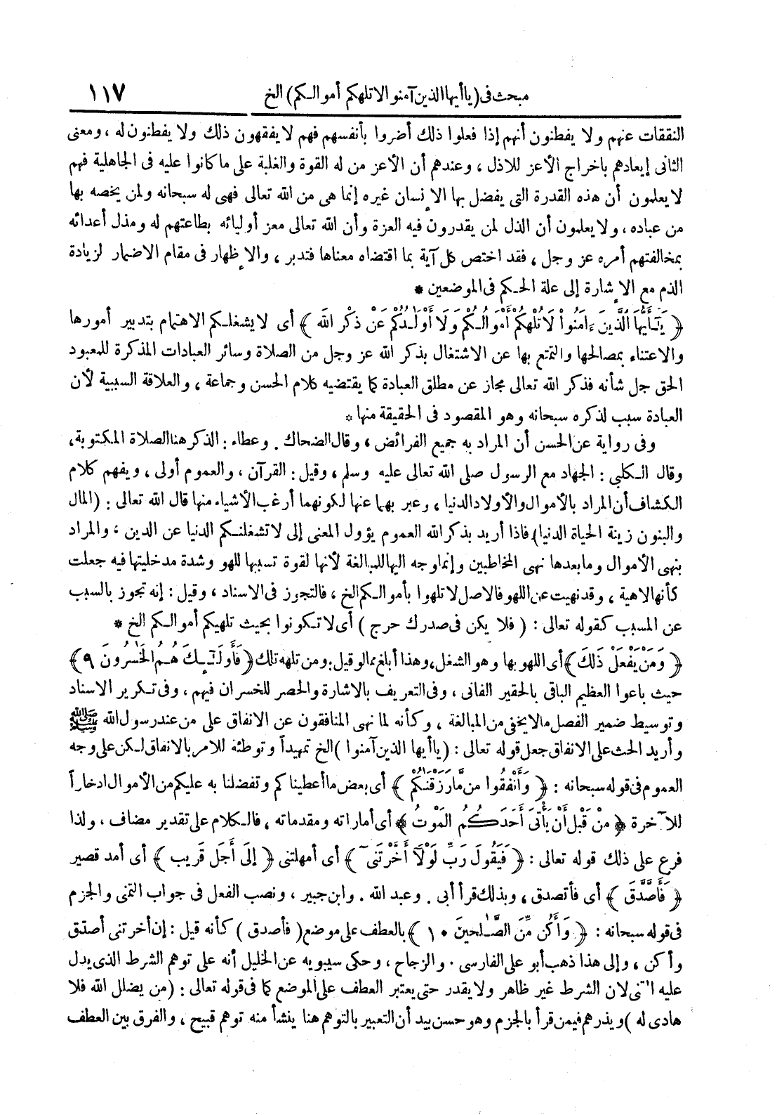 - حيث باعوا العظيم الباقي بالحقير الفاني وفي التعريف بالأشارة والحصر للخسران فيهم وفي تكرير الإسناد وتوسيط ضمير الفصل ما لا يخفى من المبالغة وكأنه لما نهى المنافقون عن الإنفاق على من عند رسول الله صلى الله عليه و سلم وأريد الحث على الإنفاق جعل قوله تعالى : يا أيها الذين آمنوا الخ تمهيدا وتوطئة للأمر بالإنفاق لكن على وجه العموم في قوله سبحانه : وأنفقوا من ما رزقناكم أي بعض ما أعطيناكم وتفضلنا به عليكم من الأموال ادخارا للآخرة من قبل أن يأتي أحدكم الموت أي أماراته ومقدماته فالكلام على تقدير مضاف ولذا فرع على ذلك قوله تعالى : فيقول رب لو لا أخرتني أي أمهلتني إلى أجل قريب أي أمد قصير فأصدق أي فأتصدق وبذلك قرأ أبي وعبد الله وابن جبير ونصب الفعل في جواب التمني والجزم في قوله سبحانه : وأكن من الصالحين