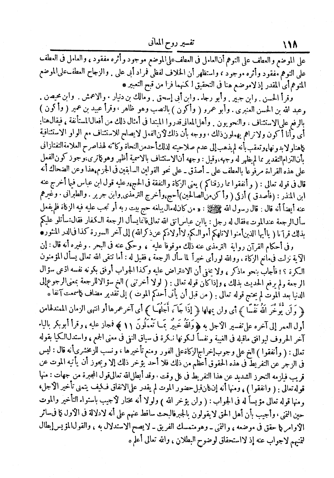 وفي أحكام القرآن رواية الترمذي عنه ذلك موقوفا عليه وحكى عنه في البحر وغيره أنه قال : إن الآية نزلت في مانع الزكاة ووالله لو رأى خيرا لما سأل الرجعة فقيل له : أما تتقي الله يسأل المؤمنون الكفرة ! فأجاب بنحو ما ذكر ولا يخفى أن الأعتراض عليه وكذا الجواب أوفق بكونه نفسه ادعى سؤالالرجعة ولم يرفع الحديث بذلك وإذا كان قوله تعالى : لو لا أخرتني الخ سؤالا للرجعة بمعنى الرجوع إلى الدنيا بعد الموت لم يحتج قوله تعالى : من قبل أن يأتي أحدكم الموت إلى تقدير مضاف كما سمعت آنفا