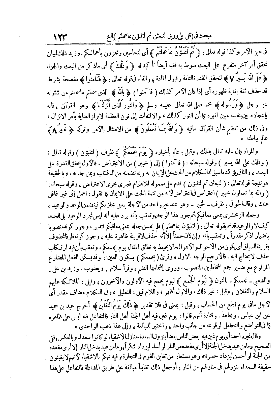 - لتحقق القدرة التامة وقبول المادة والفاء في قوله تعالى : فآمنوا مفصحة بشرط قد حذف يقة بغاية ظهوره أي إذاكان الأمر كذلك فآمنوا بالله الذي سمعتم ما سمعتم من شئونه عز و جل ورسوله محمد صلى الله تعالى عليه وسلم والنور الذيأنزلنا وهو القرآن فإنه بإعجازه بين بنفسه مبين لغيره كما أن النور كذلك والألتفات إلى نون العظمة لإبراز العناية بأمر الإنزال وفي ذلك من تعظيم شأن القرآن ما فيه والله بما تعملون من الأمتثال بالأمر وتركه خبير