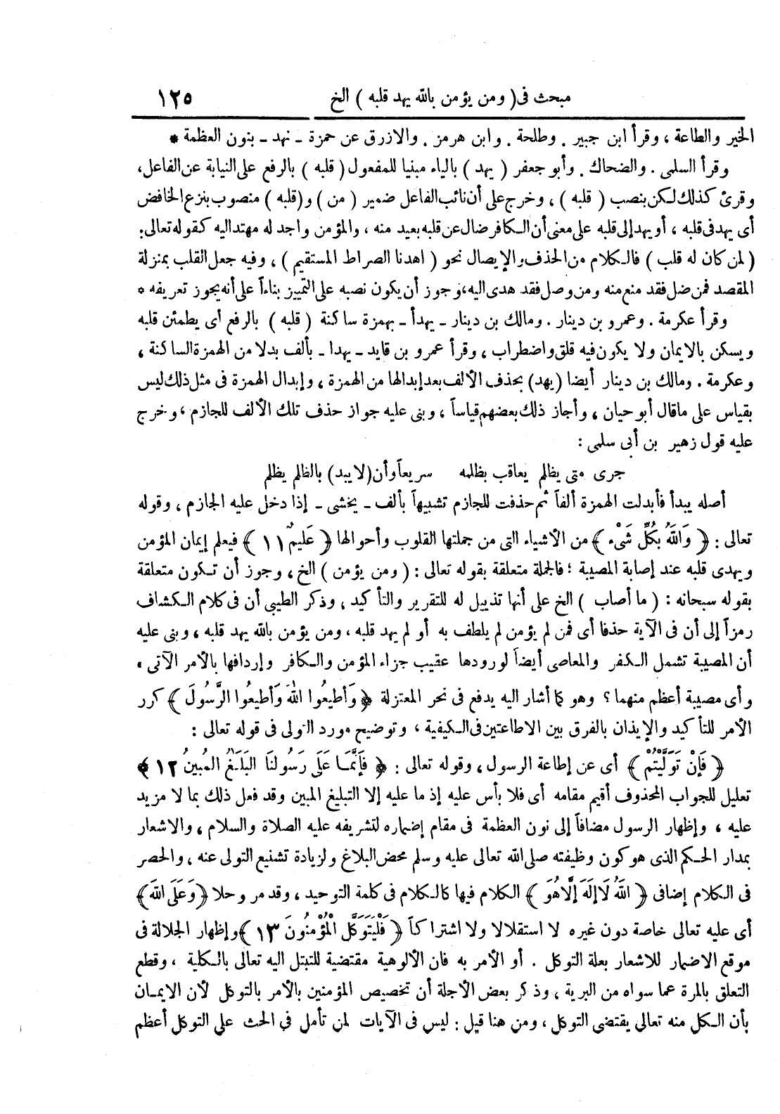 وقرأ السلمي والضحاك وأبو جعفر يهد بالياء مبنيا للمفعول قلبه بالرفع على النيابة عن الفاعل وقريء كذلك لكن بنصب قلبه وخرج على أن نائب الفاعل ضمير من و قلبه منصوب بنزع الخافض أي يهد في قلبه أو يهد إلى قلبه على معنى أن الكافر ضال عن قلبه بعيد منه والمؤمن واجد له مهتد إليه كقوله تعالى : لمن كان له قلب فالكلام من الحذف والإيصال نحو اهدنا الصراط المستقيم وفيه جعل القلب بمنزلة المقصد فمن ضل فقد منع منه ومن وصل فقد هدى إليهوجوز أن يكون نصبه على التمييز بناءا على أنه يجوز تعريفه