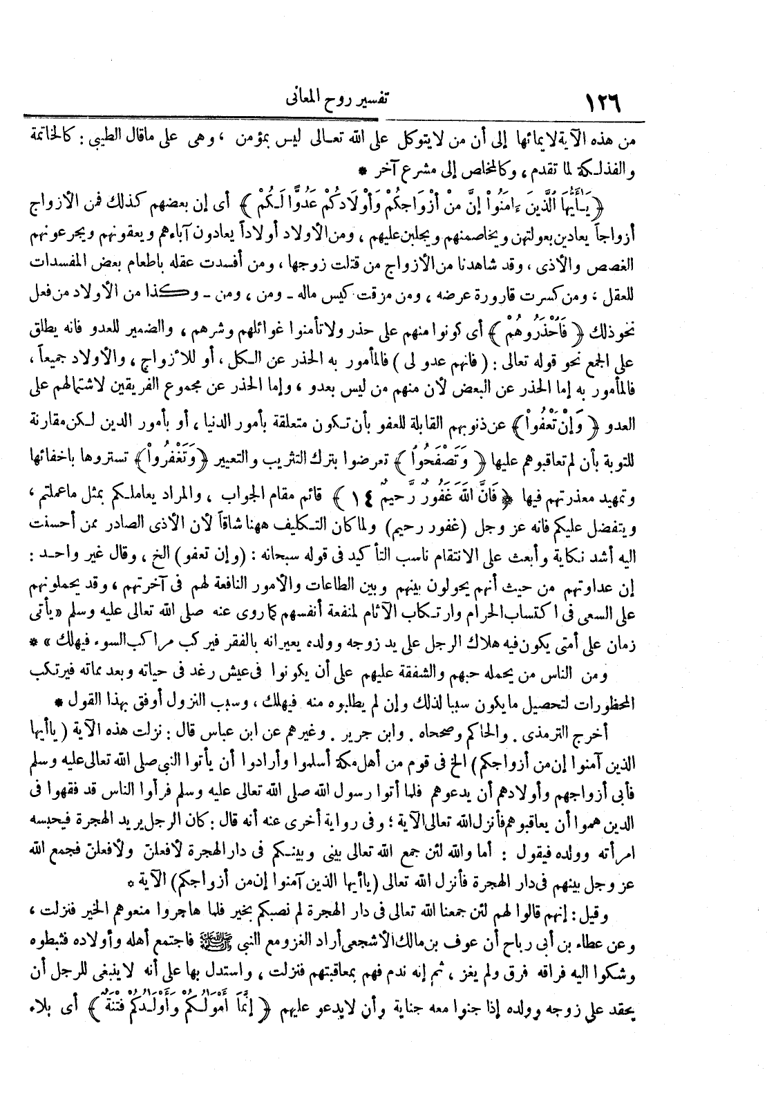 يا أيها الذين آمنواإن أزواجكم وأولادكم عدوا لكم أي إن بعضهم كذلك فمن الأزواج أزواجا يعادين بعولتهن ويخاصمنهم ويجلبن عليهم ومن الأولاد أولادا يعادون آباءهم ويعقونهم ويجرعونهم الغصص والأذى وقد شاهدنا من الأزواج من قتلت زوجها ومن افسدت عقله بإطعام بعض المفسدات للعقل ومن كسرت قارورة عرضه ومن مزقت كيس ماله ومن ومن وكذا من الأولاد من فعل نحو ذلك فاحذروهم أي كونوا منهم على حذر ولا تأمنوا غوائلهم وشرهم والضمير للعدو فإنه يطلق على الجمع نحو قوله تعالى : فإنهمعدو لي المأمور به الحذر عن الكل أو للأزواج والأولاد جميعا فالمأمور به الحذر عن البعض لأن منهم من ليس بعدو وإما الحذر عن مجموع الفريقين لاشمالهم على العدو وإن عفوا عن ذنوبهم القابلة للعفو بأن كون معلقة بأمور الدنيا أو بأمور الدينلكن مقارنةللتوبة بأن لم تعاقبوهم عليها وتصفحوا تعرضوا بترك الترثيب والتعيير وتغفروا تستروها بإخفائها وتمهيد معذرتهم فيها فإن الله غفور رحيم
