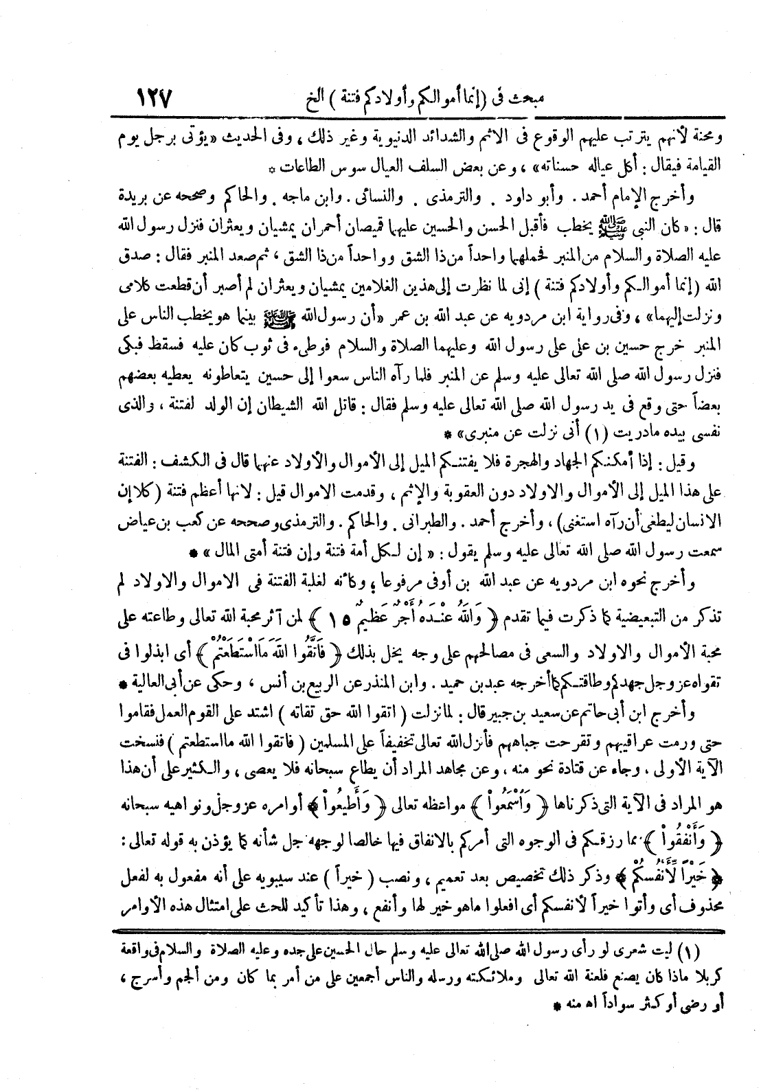 وأخرج الإمام أحمد وأبو داود والترمذي والنسائي وابن ماجه والحاكم وصححه عن بريدة قال : كان النبي صلى الله عليه و سلم يخطب فأقبل الحسن والحسين عليهما قميصان أحمران يمشيان ويعثران فنزل رسول الله عليه الصلاة و السلام من المنبر فحملهما واحدا من ذا الشق وواحدا من ذا الشق ثم صعد المنبر فقال : صدق الله إنما أموالكم وأولادكم فتنة إني لما نظرت إلى هذين الغلامين يمشيان ويعثران لم أصبر أن قطعت كلامي ونزلت إليهما وفي رواية ابن مردويه عن عبد الله بن عمر أن رسول الله صلى الله عليه و سلم بينما هو يخطب الناس على المنبر خرج حسين بن علي على رسول الله وعليهم الصلاة والسلام فوطيء في ثوب كاب عليه فسقط فبكى فنزل رسول الله صلى الله تعالى عليه وسلم عن المنبر فلما رآه الناس سعوا إلى حسين يتعاطونه يعطيه بعضهم بعضا حتى وقع في يد رسول الله صلى الله تعالى عليه وسلم فقال : قاتل الله الشيطان إن الولد لفتنة والذي نفسي بيده ما دريت أني نزلت عن منبري
