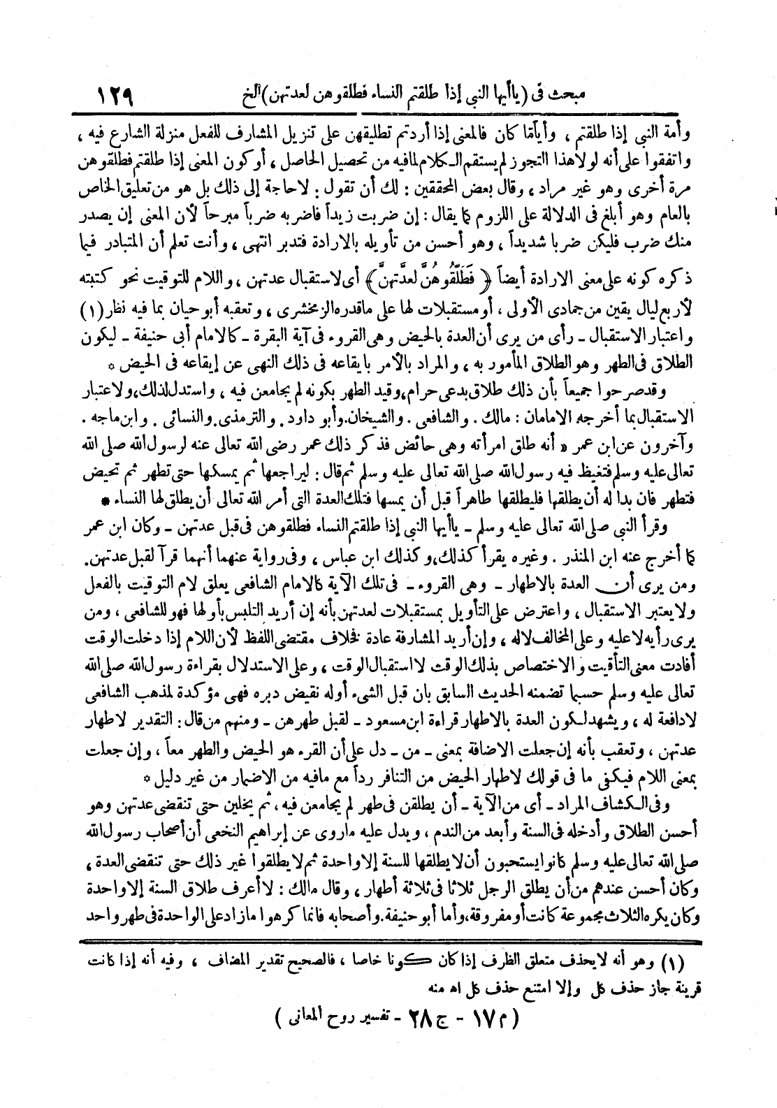وأمة النبي إذا طلقتم وأيا ما كان فالمعنى إذا أردتم تطليقهن على تنزيل المشارف للفعل منزلة الشارع فيه واتفقوا على أنه لو لا هذا التجوز لم يستقم الكلام لما فيه من تحصيل الحاصل أو كون المعنى إذا طلقتم فطلقوهن مرة أخرى وهو غير مراد وقال بعض المحققين : لك أن تقول : لا حاجة إلى ذلك بل هو تعليق الخاص بالعام وهو أبلغ في الدلالة عل اللزوم كما يقال : إن ضربت زيدا فاضربه ضربا مبرحا لأن المعنى إن يصدر منك ضرب فليكن ضربا شديدا وهو أحسن من تأويله بالإرادة فتدبر انتهى وأنت تعلم أن المتبادر فيما ذكره كونه على معنى الإرادة أيضا فطلقوهن لعدتهن أي لاستقبال عدتهن واللام للتوقيت نحو كتبته لأربع ليال يقين من جمادي الأولى أو مستقبلات لها على ما قدره الزمخشري وتعقبه أبو حيان بما فيه نظر واعتبار الأستقبال رأي من يرى أن العدة بالحيض وهي القروء في آية البقرة كالإمام أبي حنيفة ليكون الطلاق في الطهر وهو الطلاق المأمور به والمراد بالأمر بإيقاعه في ذلك النهي عن إيقاعه في الحيض